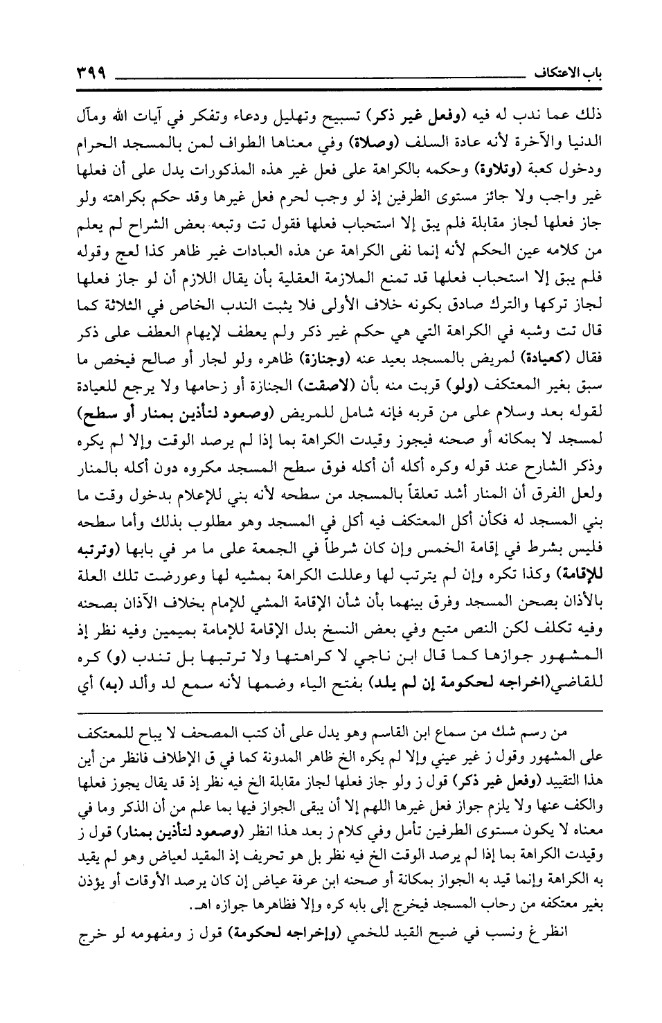 ذلك عما ندب له فيه (وفعل غير ذكر) تسبيح وتهليل ودعاء وتفكر في آيات الله ومآل الدنيا والآخرة لأنه عادة السلف (وصلاة) وفي معناها الطواف لمن بالمسجد الحرام ودخول كعبة (وتلاوة) وحكمه بالكراهة على فعل غير هذه المذكورات يدل على أن فعلها غير واجب ولا جائز مستوى الطرفين إذ لو وجب لحرم فعل غيرها وقد حكم بكراهته ولو جاز فعلها لجاز مقابلة فلم يبق إلا استحباب فعلها فقول تت وتبعه بعض الشراح لم يعلم من كلامه معين الحكم لأنه إنما نفى الكراهة عن هذه العبادات غير ظاهر كذا لعج وقوله فلم يبق إلا استحباب فعلها قد تمنع الملازمة العقلية بأن يقال اللازم أن لو جاز فعلها لجاز تركها والترك صادق بكونه خلاف الأولى فلا يثبت الندب الخاص في الثلاثة كما قال تت وشبه في الكراهة التي هي حكم غير ذكر ولم يعطف لإيهام العطف على ذكر فقال (كعيادة) لمريض بالمسجد بعيد عنه (وجنازة) ظاهره ولو لجار أو صالح فيخص ما سبق بغير المعتكف (ولو) قربت منه بأن (لاصقت) الجنازة أو زحامها ولا يرجع للعيادة لقوله بعد وسلام على من قربه فإنه شامل للمريض (وصعود لتأذين بمنار أو سطح) لمسجد لا بمكانه أو صحنه فيجوز وقيدت الكراهة بما إذا لم يرصد الوقت وإلا لم يكره وذكر الشارح عند قوله وكره أكله أن أكله فوق سطح المسجد مكروه دون أكله بالمنار ولعل الفرق أن المنار أشد تعلقًا بالمسجد من سطحه لأنه بني للإعلام بدخول وقت ما بني المسجد له فكأن أكل المعتكف فيه أكل في المسجد وهو مطلوب بذلك وأما سطحه فليس بشرط في إقامة الخمس وإن كان شرطًا في الجمعة على ما مر في بابها (وترتبه للإقامة) وكذا تكره وإن لم يترتب لها وعللت الكراهة بمشيه لها وعورضت تلك العلة بالأذان بصحن المسجد وفرق بينهما بأن شأن الإقامة المشي للإمام بخلاف الآذان بصحنه وفيه تكلف لكن النص متبع وفي بعض النسخ بدل الإقامة للإمامة بميمين وفيه نظر إذ المشهور جوازها كما قال ابن ناجي لا كراهتها ولا ترتبها بل تندب (و) كره للقاضي (إخراجه لحكومة إن لم يلد) بفتح الياء وضمها لأنه سمع لد وأنشد (به) أي