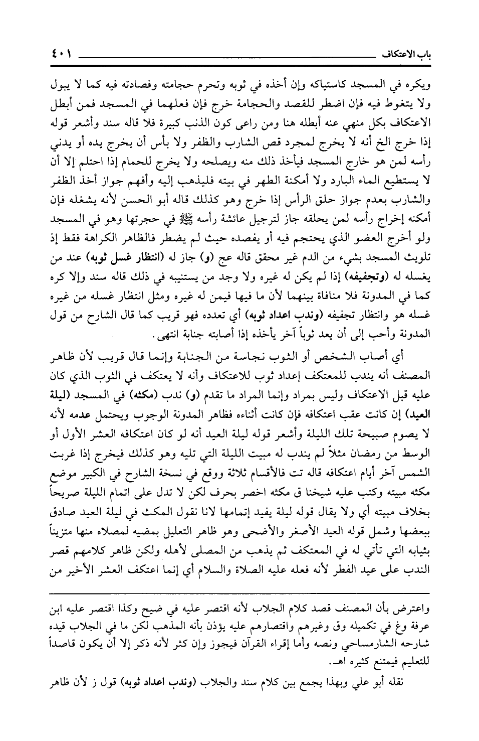 أي أصاب الشخص أو الثوب نجاسة من الجنابة وإنما قال قريب لأن ظاهر المصنف أنه يندب للمعتكف إعداد ثوب للاعتكاف وأنه لا يعتكف في الثوب الذي كان عليه قبل الاعتكاف وليس بمراد وإنما المراد ما تقدم (و) ندب (مكثه) في المسجد (ليلة العيد) إن كانت عقب اعتكافه فإن كانت أثناءه فظاهر المدونة الوجوب ويحتمل عدمه لأنه لا يصوم صبيحة تلك الليلة وأشعر قوله ليلة العيد أنه لو كان اعتكافه العشر الأول أو الوسط من رمضان مثلًا لم يندب له مبيت الليلة التي تليه وهو كذلك فيخرج إذا غربت الشمس آخر أيام اعتكافه قاله تت فالأقسام ثلاثة ووقع في نسخة الشارح في الكبير موضع مكثه مبيته وكتب عليه شيخنا ق مكثه اخصر بحرف لكن لا تدل على إتمام الليلة صريحًا بخلاف مبيته أي ولا يقال قوله ليلة يفيد إتمامها لانا نقول المكث في ليلة العيد صادق ببعضها وشمل قوله العيد الأصغر والأضحى وهو ظاهر التعليل بمضيه لمصلاه منها متزينًا بثيابه التي تأتي له في المعتكف ثم يذهب من المصلى لأهله ولكن ظاهر كلامهم قصر الندب على عيد الفطر لأنه فعله عليه الصلاة والسلام أي إنما اعتكف العشر الأخير من