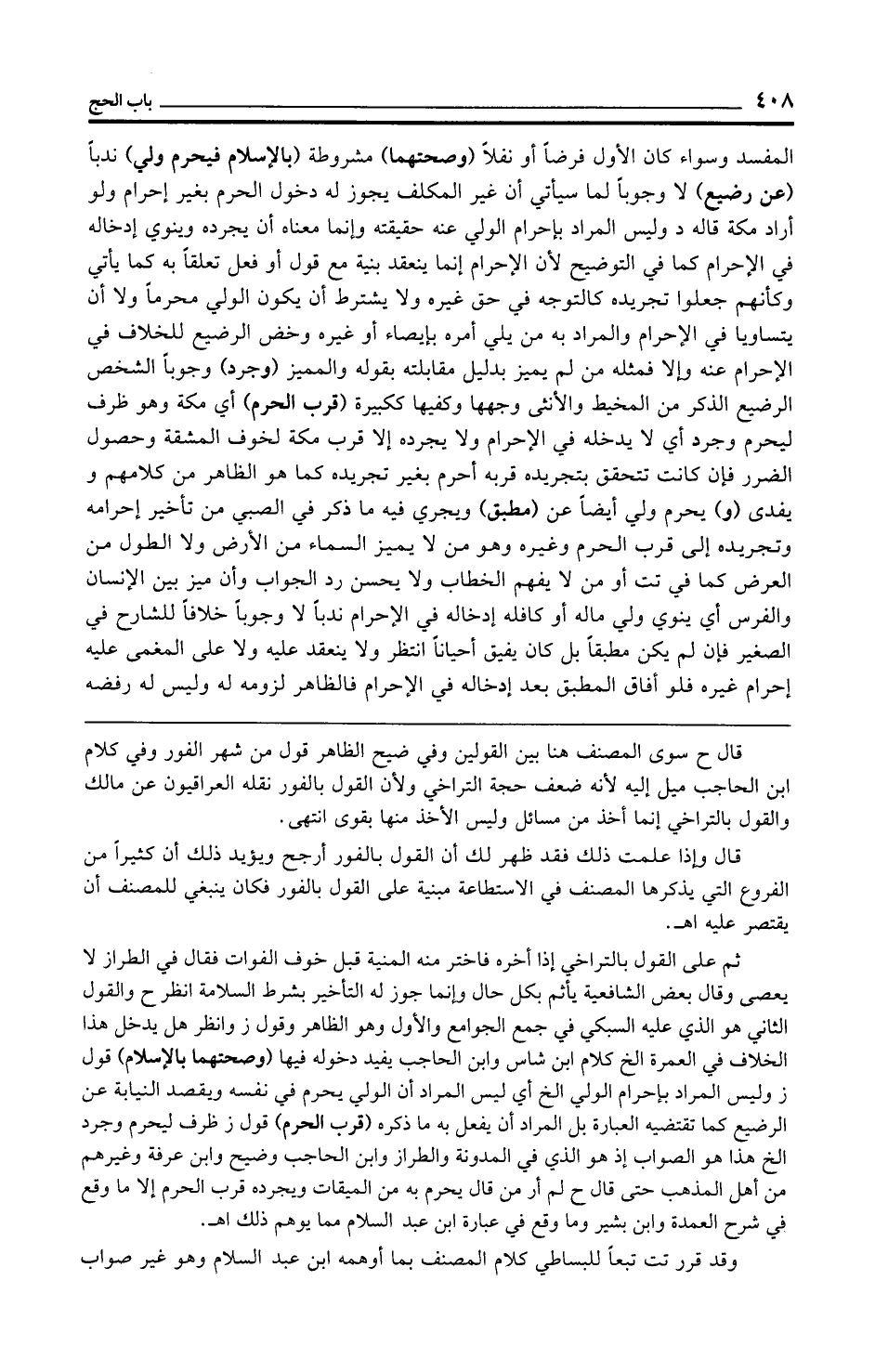 ثم على القول بالتراخي إذا أخره فاختر منه المنية قبل خوف الفوات فقال في الطراز لا يعصى وقال بعض الشافعية يأثم بكل حال وإنما جوز له التأخير بشرط السلامة انظر ح والقول الثاني هو الذي عليه السبكي في جمع الجوامع والأول وهو الظاهر وقول ز وانظر هل يدخل هذا الخلاف في العمرة الخ كلام ابن شاس وابن الحاجب يفيد دخوله فيها (وصحتهما بالإِسلام) قول ز وليس المراد بإحرام الولي الخ أي ليس المراد أن الولي يحرم في نفسه ويقصد النيابة عن الرضيع كما تقتضيه العبارة بل المراد أن يفعل به ما ذكره (قرب الحرم) قول ز ظرف ليحرم وجرد الخ هذا هو الصواب إذ هو الذي في المدونة والطراز وابن الحاجب وضيح وابن عرفة وغيرهم من أهل المذهب حتى قال ح لم أر من قال يحرم به من الميقات ويجرده قرب الحرم إلا ما وقع في شرح العمدة وابن بشير وما وقع في عبارة ابن عبد السلام مما يوهم ذلك اهـ.