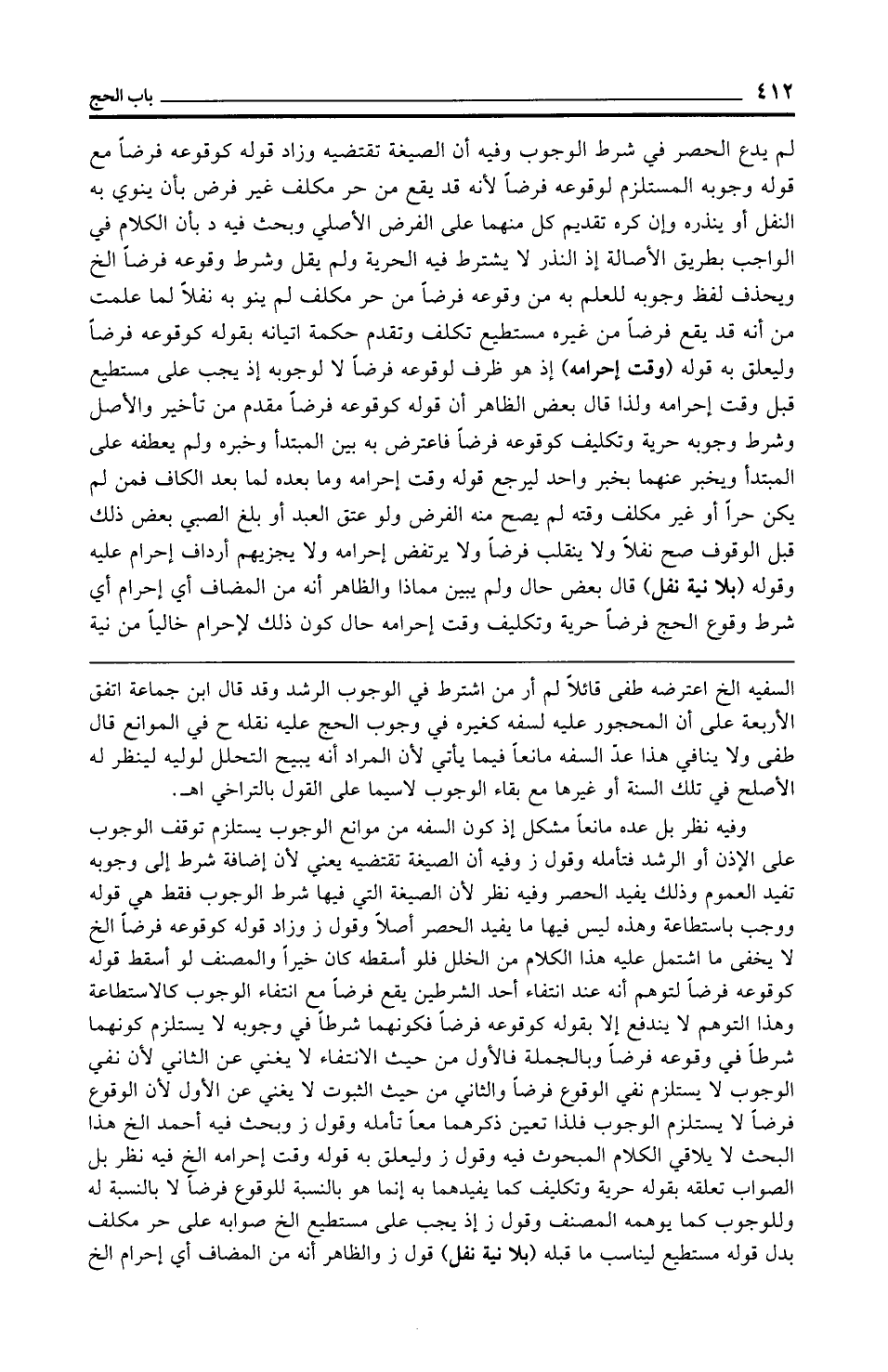 وفيه نظر بل عده مانعًا مشكل إذ كون السفه من موانع الوجوب يستلزم توقف الوجوب على الإذن أو الرشد فتأمله وقول ز وفيه أن الصيغة تقتضيه يعني لأن إضافة شرط إلى وجوبه تفيد العموم وذلك يفيد الحصر وفيه نظر لأن الصيغة التي فيها شرط الوجوب فقط هي قوله ووجب باستطاعة وهذه ليس فيها ما يفيد الحصر أصلًا وقول ز وزاد قوله كوقوعه فرضًا الخ لا يخفى ما اشتمل عليه هذا الكلام من الخلل فلو أسقطه كان خيرًا والمصنف لو أسقط قوله كوقوعه فرضًا لتوهم أنه عند انتفاء أحد الشرطين يقع فرضًا مع انتفاء الوجوب كالاستطاعة وهذا التوهم لا يندفع إلا بقوله كوقوعه فرضًا فكونهما شرطًا في وجوبه لا يستلزم كونهما شرطًا في وقوعه فرضًا وبالجملة فالأول من حيث الانتفاء لا يغني عن الثاني لأن نفي الوجوب لا يستلزم نفي الوقوع فرضًا والثاني من حيث الثبوت لا يغني عن الأول لأن الوقوع فرضًا لا يستلزم الوجوب فلذا تعين ذكرهما معًا تأمله وقول ز وبحث فيه أحمد الخ هذا البحث لا يلاقي الكلام المبحوث فيه وقول ز وليعلق به قوله وقت إحرامه الخ فيه نظر بل الصواب تعلقه بقوله حرية وتكليف كما يفيدهما به إنما هو بالنسبة للوقوع فرضًا لا بالنسبة له وللوجوب كما يوهمه المصنف وقول ز إذ يجب على مستطيع الخ صوابه على حر مكلف بدل قوله مستطيع ليناسب ما قبله (بلا نية نفل) قول ز والظاهر أنه من المضاف أي إحرام الخ