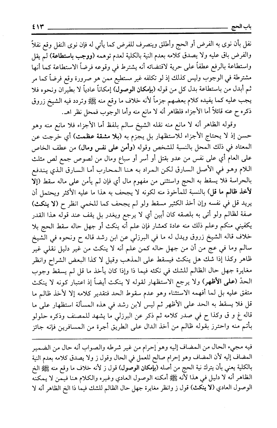 وقوله الظاهر أنه لا مانع منه نقله الشيخ سالم بلفظ أما الإجزاء فلا مانع منه وهو حسن إذ لا يحتاج الإجزاء للاستظهار بل يجزم به (بلا مشقة عظمت) أي خرجت عن المعتاد في ذلك المحل بالنسبة للشخص وقوله (وأمن على نفس ومال) من عطف الخاص على العام أي على نفس من عدو بقتل أو أسر أو سباع ومال من لصوص جمع لص مثلث اللام وهو في الأصل السارق لكن المراد به هنا المحارب أما السارق الذي يندفع بالحراسة فلا يسقط به الحج واستثنى من مفهوم مال أي فإن لم يأمن على ماله سقط (إلا لأخذ ظالم ما قل) بالنسبة للمأخوذ منه لكونه لا يجحف به هذا ما عليه الأكثر ويحتمل أن يريد قل في نفسه وإن أخذ الكثير مسقط ولو لم يجحف كما للخمي انظر ح (لا ينكث) صفة لظالم ولو أتى به بلصقه كان أبين أي لا يرجع ويغدر بل يقف عند قوله هذا القدر يكفيني منكم وعلم ذلك منه عادة كعشار فإن علم أنه ينكث أو جهل حاله سقط الحج بلا خلاف قاله الشيخ زروق ويدل له ما في البرزلي عن ابن رشد قاله ح ونحوه في الشيخ سالم وما في عج من أن من جهل حاله كمن علم أنه لا ينكث من غير دليل نقلي غير ظاهر وكذا إذا شك هل ينكث فيسقط على المذهب وقيل لا كذا البعض الشراح وانظر مغايرة جهل حال الظالم للشك في نكثه فيما ذا وإذا كان يأخذ ما قل لم يسقط وجوب الحدّ (على الأظهر) ولا يرجع الاستظهار لقوله لا ينكث أيضًا إذ اعتبار كونه لا ينكث متفق عليه بل لما أفهمه الاستثناء وهو عدم سقوط الحد فتقدير كلامه إلا لأخذ ظالم ما قل فلا يسقط به الحد على الأظهر ثم ليس لابن رشد في هذه المسألة استظهار على ما قاله غ وق وكذا ح في صدر كلامه ثم ذكر عن البرزلي ما يشهد للمصنف وذكره حلولو بأتم منه واحترز بقوله ظالم من أخذ الدال على الطريق أجرة من المسافرين فإنه جائز