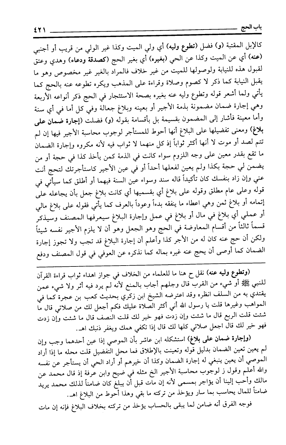 كالإبل المقتبة (و) فضل (تطوع وليه) أي ولي الميت وكذا غير الولي من قريب أو أجنبي (عنه) أي عن الميت وكذا عن الحي (بغيره) أي بغير الحج (كصدقة ودعاء) وهدي وعتق لقبول هذه للنيابة ولوصولها للميت من غير خلاف فالمراد بالغير غير مخصوص وهو ما يقبل النيابة كما ذكر لا كصوم وصلاة وقراءة على المذهب ويكره تطوعه عنه بالحج كما يأتي ولما أشعر قوله وتطوع وليه عنه بغيره بصحة الاستئجار في الحج ذكر أنواعه الأربعة وهي إجارة ضمان مضمونة بذمة الأجير أو بعينه وبلاغ جعالة وفي كل أما في أي سنة وأما عينة فأشار إلى المضمون بقسيمة بل بأقسامة بقوله (و) فضلت (إجارة ضمان على بلاغ) ومعنى تفضيلها على البلاغ أنها أحوط للمستأجر لوجوب محاسبة الأجير فيها إن لم تتم لصد أو موت لا أنها أكثر ثوابًا إذ كل منهما لا ثواب فيه لأنه مكروه وإجارة الضمان ما تقع بقدر معين على وجه اللزوم سواء كانت في الذمة كمن يأخذ كذا في حجة أو من يضمن لي حجة بكذا ولم يعين لفعلها أحدًا أو في معين الأجير كاستأجرتك لتحج أنت عني وإن زاد بنفسك كان تأكيدًا قاله سند وسواء معين السنة فيهما أو أطلق كما سيأتي في قوله وعلى عام مطلق وقوله على بلاغ أي بقسميها أي كانت بلاع جعل بأن يجاعله على إتمامه أو بلاغ ثمن وهي إعطاء ما ينفقه بدءًا وعودًا بالعرف كما يأتي فقوله على بلاغ مالي أو عملي أي بلاغ في مال أو بلاغ في عمل وإجارة البلاغ سيعرفها المصنف وسيذكر قسمًا ثالثًا من أقسام المعاوضة في الحج وهو الجعل وهو أن لا يلزم الأجير نفسه شيئًا ولكن أن حج عنه كان له من الأجر كذا وأعلم أن إجارة البلاغ قد تجب ولا تجوز إجارة الضمان كما أوصى أن يحج عنه غيره بماله كما نذكره عن العوفي في قول المصنف ودفع