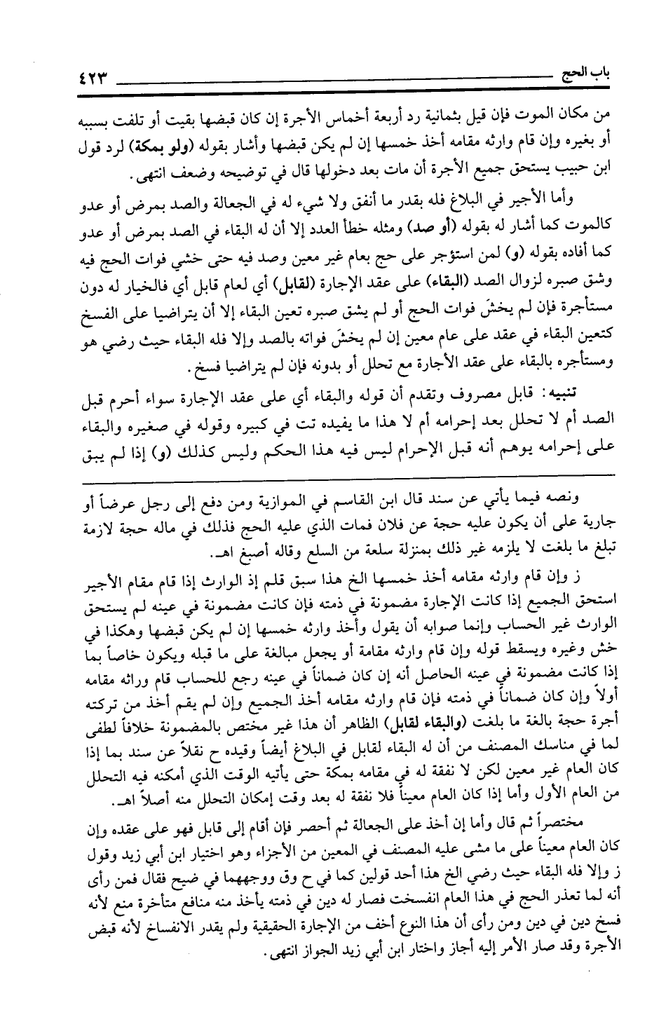ز وإن قام وارثه مقامه أخذ خمسها الخ هذا سبق قلم إذ الوارث إذا قام مقام الأجير استحق الجميع إذا كانت الإجارة مضمونة في ذمته فإن كانت مضمونة في عينه لم يستحق الوارث غير الحساب وإنما صوابه أن يقول وأخذ وارثه خمسها إن لم يكن قبضها وهكذا في خش وغيره ويسقط قوله وإن قام وارثه مقامة أو يجعل مبالغة على ما قبله ويكون خاصًّا بما إذا كانت مضمونة في عينه الحاصل أنه إن كان ضمانًا في عينه رجع للحساب قام وراثه مقامه أولًا وإن كان ضمانًا في ذمته فإن قام وارثه مقامه أخذ الجميع وإن لم يقم أخذ من تركته أجرة حجة بالغة ما بلغت (والبقاء لقابل) الظاهر أن هذا غير مختص بالمضمونة خلافًا لطفى لما في مناسك المصنف من أن له البقاء لقابل في البلاغ أيضًا وقيده ح نقلًا عن سند بما إذا كان العام غير معين لكن لا نفقة له في مقامه بمكة حتى يأتيه الوقت الذي أمكنه فيه التحلل من العام الأول وأما إذا كان العام عينًا فلا نفقة له بعد وقت إمكان التحلل منه أصلًا اهـ.