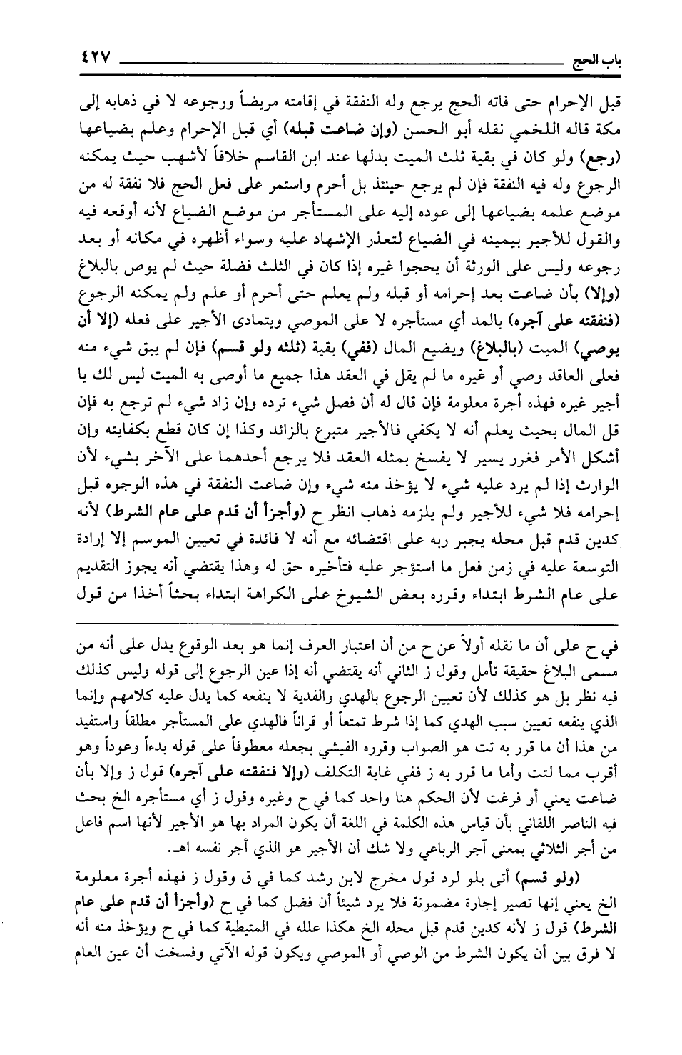 في ح على أن ما نقله أولًا عن ح من أن اعتبار العرف إنما هو بعد الوقوع يدل على أنه من مسمى البلاغ حقيقة تأمل وقول ز الثاني أنه يقتضي أنه إذا معين الرجوع إلى قوله وليس كذلك فيه نظر بل هو كذلك لأن تعيين الرجوع بالهدي والفدية لا ينفعه كما يدل عليه كلامهم وإنما الذي ينفعه تعيين سبب الهدي كما إذا شرط تمتعًا أو قرانًا فالهدي على المستأجر مطلقًا واستفيد من هذا أن ما قرر به تت هو الصواب وقرره الفيشي بجعله معطوفًا على قوله بدءًا وعودًا وهو أقرب مما لتت وأما ما قرر به ز ففي غاية التكلف (وإلا فنفقته على آجره) قول ز وإلا بأن ضاعت يعني أو فرغت لأن الحكم هنا واحد كما في ح وغيره وقول ز أي مستأجره الخ بحث فيه الناصر اللقاني بأن قياس هذه الكلمة في اللغة أن يكون المراد بها هو الأجير لأنها اسم فاعل من أجر الثلاثي بمعنى آجر الرباعي ولا شك أن الأجير هو الذي أجر نفسه اهـ.