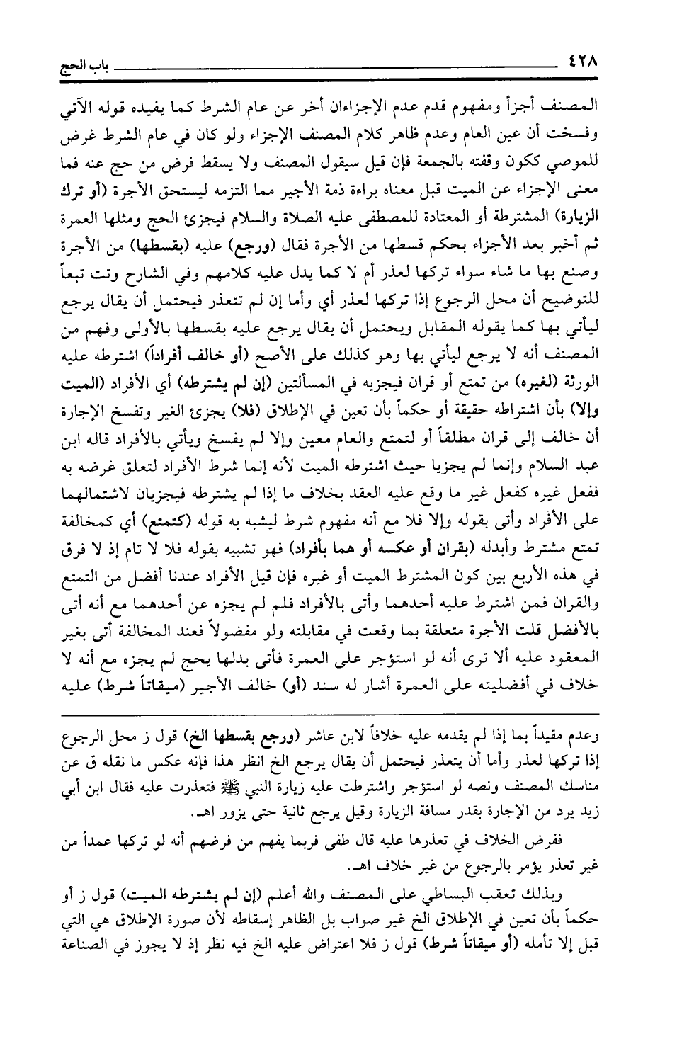 وعدم مقيدًا بما إذا لم يقدمه عليه خلافًا لابن عاشر (ورجع بقسطها الخ) قول ز محل الرجوع إذا تركها لعذر وأما أن يتعذر فيحتمل أن يقال يرجع الخ انظر هذا فإنه عكس ما نقله ق عن مناسك المصنف ونصه لو استؤجر واشترطت عليه زيارة النبي - صلى الله عليه وسلم - فتعذرت عليه فقال ابن أبي زيد يرد من الإجارة بقدر مسافة الزيارة وقيل يرجع ثانية حتى يزور اهـ.