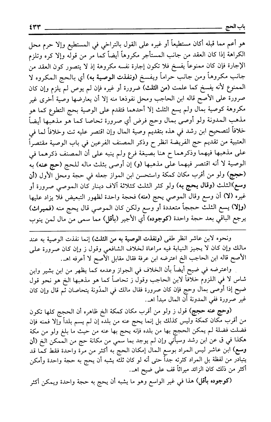 واعترضه في ضيح أيضًا بأن الخلاف في الجواز وعدمه كما يظهر من ابن بشير وابن شاس لا في اللزوم خلافًا لابن الحاجب وقول ز تحاصًا كما هو مذهبها الخ هو نحو قول ضيح إذا أوصى بمال وحج فإن كان صرورة فقال مالك في المدّونة يتحاصان ثم قال وإن كان غير صرورة ففي المدونة أن المال مبدأ اهـ.