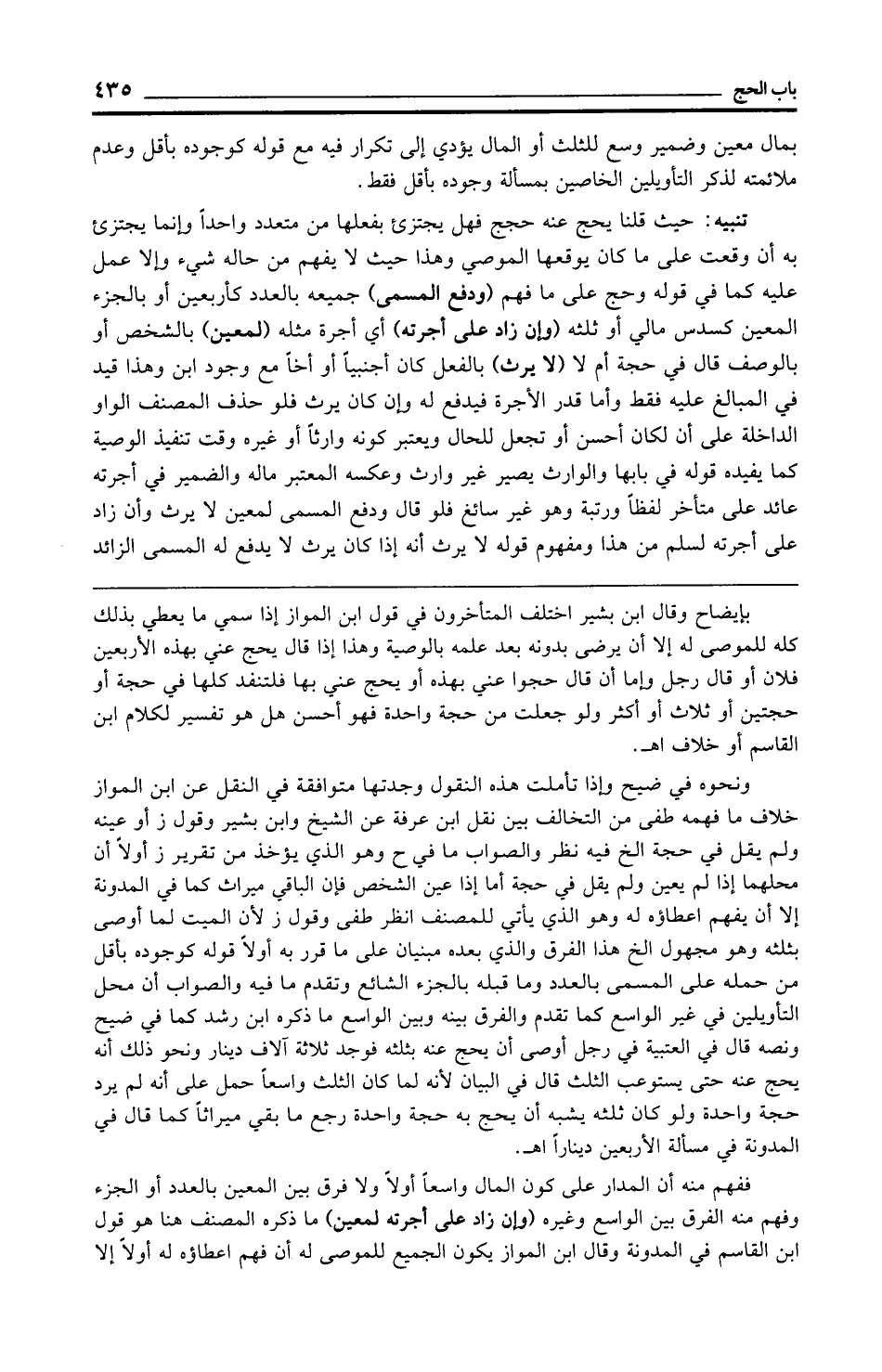 ونحوه في ضيح وإذا تأملت هذه النقول وجدتها متوافقة في النقل عن ابن المواز خلاف ما فهمه طفى من التخالف بين نقل ابن عرفة عن الشيخ وابن بشير وقول ز أو عينه ولم يقل في حجة الخ فيه نظر والصواب ما في ح وهو الذي يؤخذ من تقرير ز أولًا أن محلهما إذا لم يعين ولم يقل في حجة أما إذا عين الشخص فإن الباقي ميراث كما في المدونة إلا أن يفهم إعطاؤه له وهو الذي يأتي للمصنف انظر طفى وقول ز لأن الميت لما أوصى بثلثه وهو مجهول الخ هذا الفرق والذي بعده مبنيان على ما قرر به أولًا قوله كوجوده بأقل من حمله على المسمى بالعدد وما قبله بالجزء الشائع وتقدم ما فيه والصواب أن محل التأويلين في غير الواسع كما تقدم والفرق بينه وبين الواسع ما ذكره ابن رشد كما في ضيح ونصه قال في العتبية في رجل أوصى أن يحج عنه بثلثه فوجد ثلاثة آلاف دينار ونحو ذلك أنه يحج عنه حتى يستوعب الثلث قال في البيان لأنه لما كان الثلث واسعًا حمل على أنه لم يرد حجة واحدة ولو كان ثلثه يشبه أن يحج به حجة واحدة رجع ما بقي ميراثًا كما قال في المدونة في مسألة الأربعين دينارًا اهـ.