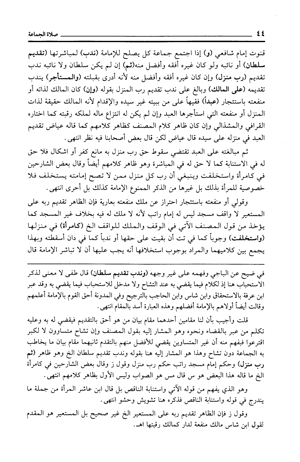قنوت إمام شافعي (و) إذا اجتمع جماعة كل يصلح للإمامة (ندب) لمباشرتها (تقديم سلطان) أو نائبه ولو كان غيره أفقه وأفضل منه (ثم) إن لم يكن سلطان ولا نائبه ندب تقديم (رب منزل) وإن كان غيره أفقه وأفضل منه لأنه أدرى بقبلته (والمستأجر) يندب تقديمه (على المالك) وبالغ على ندب تقديم رب المنزل بقوله (وإن) كان المالك لذاته أو منفعته باستئجار (عبدًا) فقيهًا على من ببيته غير سيده والإقدام لأنه المالك حقيقة لذات المنزل أو منفعته التي استأجرها العبد وإن لم يكن له انتزاع ماله لملكه رقبته كما اختاره القرافي والمشذالي وإن كان ظاهر كلام المصنف كظاهر كلامهم كما قاله عياض تقديم العبد في منزله على سيده قال عياض لكن قال بعض أصحابنا فيه نظر انتهى.