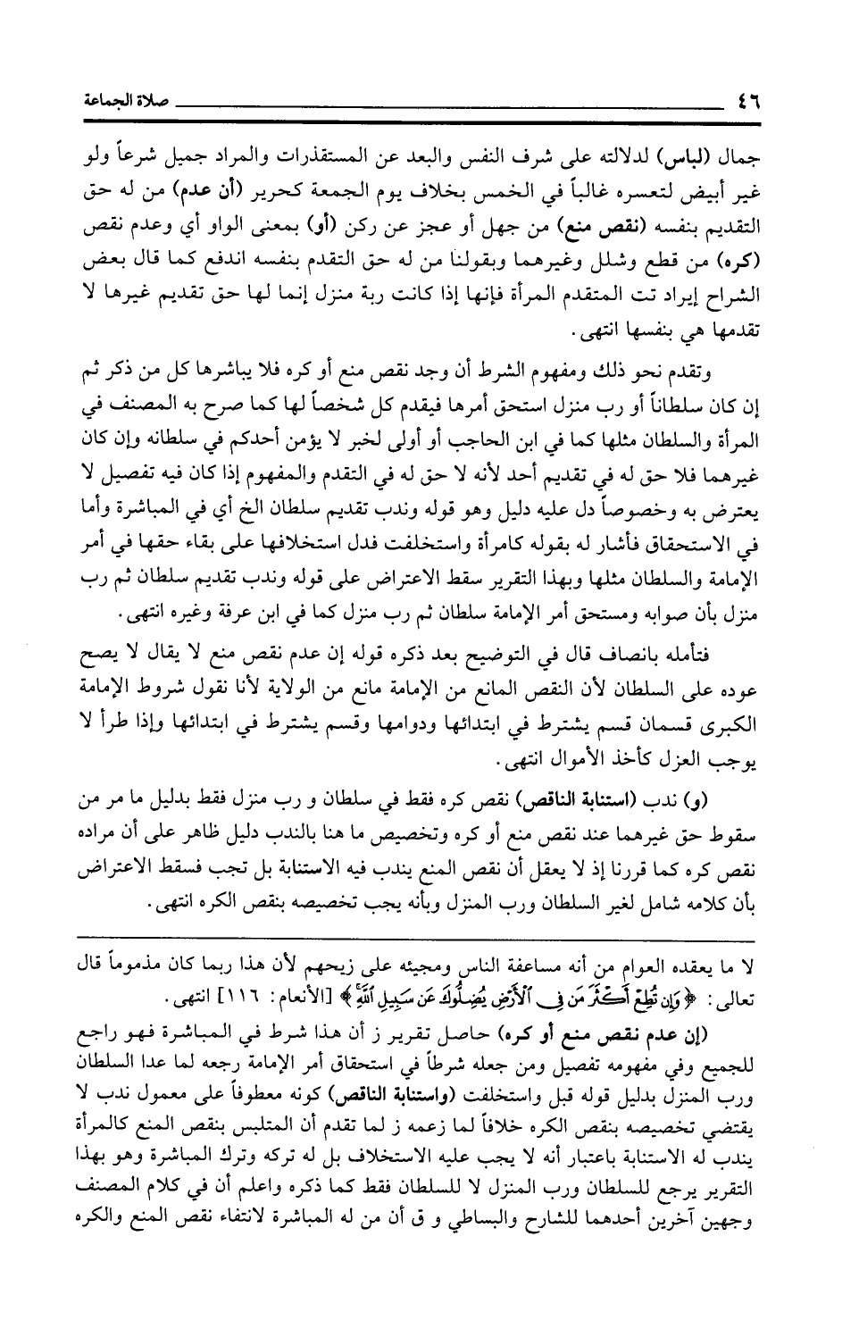 وتقدم نحو ذلك ومفهوم الشرط أن وجد نقص منع أو كره فلا يباشرها كل من ذكر ثم إن كان سلطانًا أو رب منزل استحق أمرها فيقدم كل شخصًا لها كما صرح به المصنف في المرأة والسلطان مثلها كما في ابن الحاجب أو أولى لخبر لا يؤمن أحدكم في سلطانه وإن كان غيرهما فلا حق له في تقديم أحد لأنه لا حق له في المتقدم والمفهوم إذا كان فيه تفصيل لا يعترض به وخصوصًا دل عليه دليل وهو قوله وندب تقديم سلطان الخ أي في المباشرة وأما في الاستحقاق فأشار له بقوله كامرأة واستخلفت فدل استخلافها على بقاء حقها في أمر الإمامة والسلطان مثلها وبهذا التقرير سقط الاعتراض على قوله وندب تقديم سلطان ثم رب منزل بأن صوابه ومستحق أمر الإمامة سلطان ثم رب منزل كما في ابن عرفة وغيره انتهى.