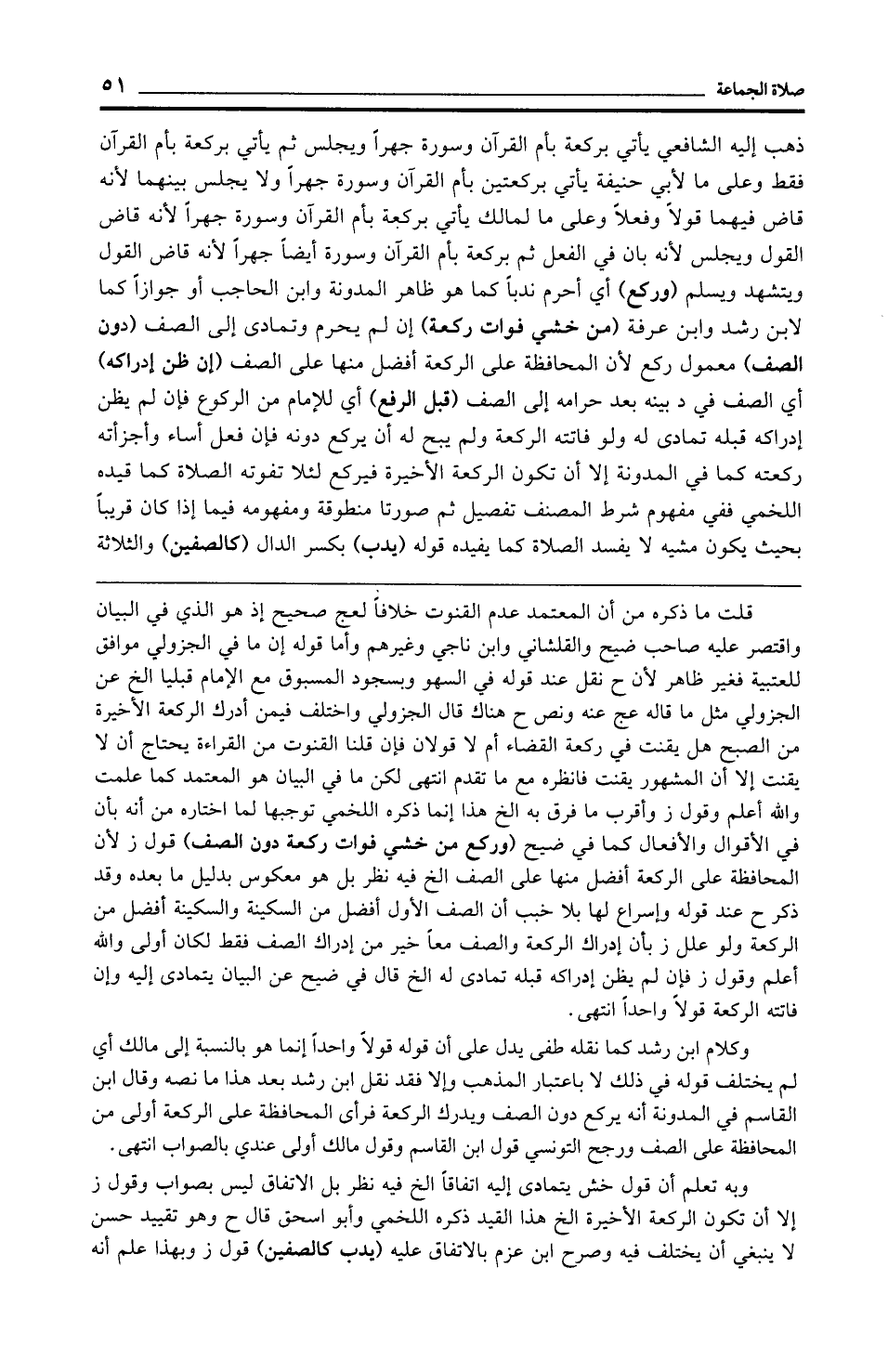 وكلام ابن رشد كما نقله طفى يدل على أن قوله قولًا واحدًا إنما هو بالنسبة إلى مالك أي لم يختلف قوله في ذلك لا باعتبار المذهب وإلا فقد نقل ابن رشد بعد هذا ما نصه وقال ابن القاسم في المدونة أنه يركع دون الصف ويدرك الركعة فرأى المحافظة على الركعة أولى من المحافظة على الصف ورجح التونسي قول ابن القاسم وقول مالك أولى عندي بالصواب انتهى.