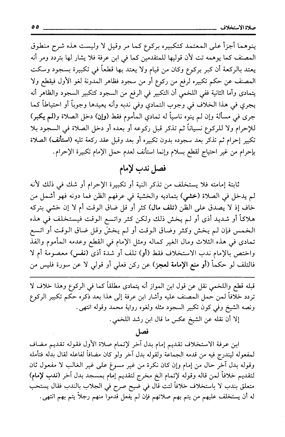 ابن عرفة الاستخلاف تقديم إمام بدل آخر لإتمام صلاة الأول فقوله تقديم مضاف لمفعوله ليندرج فيه من قدمه الجماعة ولقوله بدل آخر ولو كان مضافًا لفاعله لقال بدله فتأمله وقوله بدل آخر حال من إمام وإن كان نكرة من غير مسوغ على غير الغالب لا مفعول ثان لتقديم خلافًا لمن قاله وقوله لإتمام الخ مخرج لتقديم إمام بمسجد بدل آخر (ندب لإمام) متعلق بندب لا باستخلاف خلافًا لتت قال في ضيح صرح في الجلاب بالندب فقال يستحب له أن يستخلف عليهم من يتم بهم صلاتهم فإن لم يفعل قدموا منهم رجلًا يتم بهم انتهى.