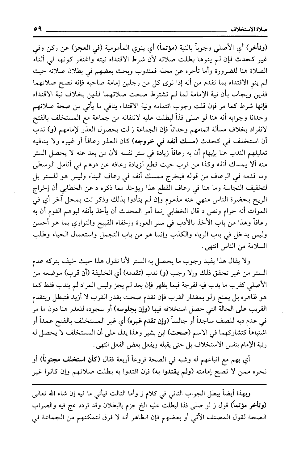(وتأخر) أي الأصلي وجوبًا بالنية (مؤتما) أي ينوي المأمومية (في العجز) عن ركن وفي غير كحدث فإن لم ينوها بطلت صلاته لأن شرط الاقتداء نيته واغتفر كونها في أثناء الصلاة هنا للضرورة وأما تأخره عن محله فمندوب وبحث بعضهم في بطلان صلاته حيث لم ينوِ الاقتداء بما تقدم من أنه إذا نوى كل من رجلين إمامة صاحبه فإنه تصح صلاتهما فذين ويجاب بأن نية الإمامة لما لم تشترط صحت صلاتهما فذين بخلاف نية الاقتداء فإنها شرط كما مر فإن قلت وجوب ائتمامه ونية الاقتداء ينافي ما يأتي من صحة صلاتهم وحدانا وجوابه أنه هنا لو صلى فذًّا لبطلت عليه لانتقاله من جماعة مع المستخلف بالفتح لانفراد بخلاف مسألة إتمامهم وحدانًا فإن الجماعة زالت بحصول العذر لإمامهم (و) ندب أن استخلف في كحدث (مسك أنفه في خروجه) كان العذر رعافًا أو غيره ولا ينافيه تعليلهم الندب هنا بإيهام أن به رعافًا زيادة في ستر نفسه لأن من بعد عنه لا يحصل الستر منه ألا يمسك أنفه وكذا من قرب حيث قطع لزيادة رعافه عن درهم في أنامل الوسطى وما قدمه في الرعاف من قوله فيخرج ممسك أنفه في رعاف البناء وليس هو للستر بل لتخفيف النجاسة وما هنا في رعاف القطع هذا ويؤخذ مما ذكره د عن الخطابي أن إخراج الريح بحضرة الناس منهي عنه مذموم وإن لم يتأذوا بذلك وذكر تت بمحل آخر أي في الموات أنه حرام ونص د قال الخطابي إنما أمر المحدث أن يأخذ بأنفه ليوهم القوم أن به رعافًا وهذا من باب الأخذ بالأدب في ستر العورة وإخفاء القبيح والتواري بما هو أحسن وليس يدخل في باب الرياء والكذب وإنما هو من باب التجمل واستعمال الحياء وطلب السلامة من الناس انتهى.