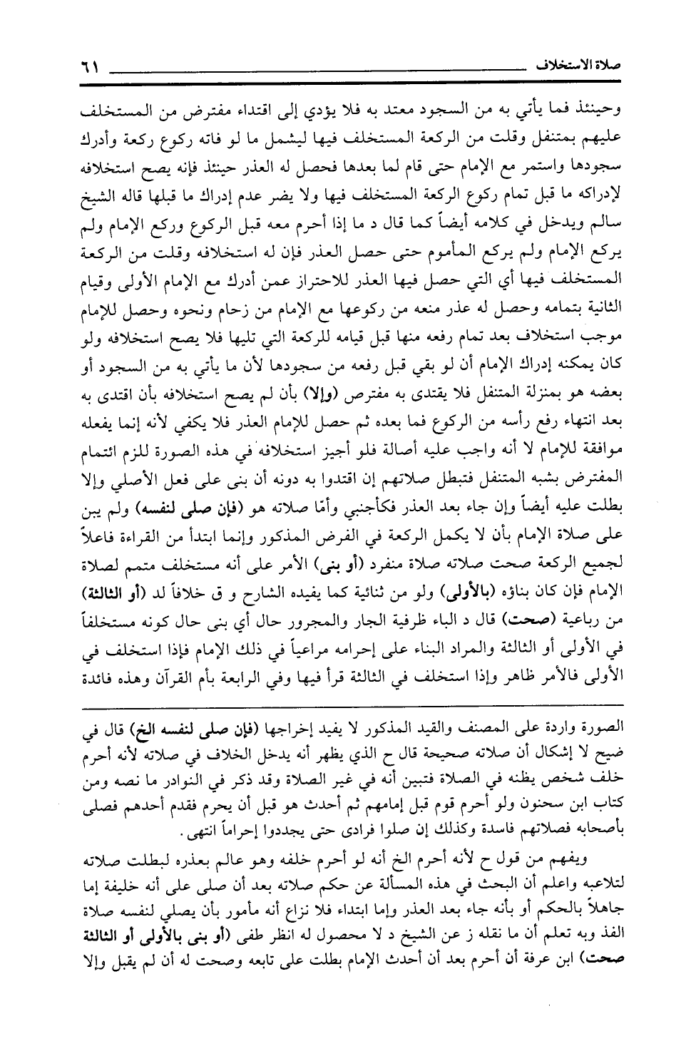 وحينئذ فما يأتي به من السجود معتد به فلا يؤدي إلى اقتداء مفترض من المستخلف عليهم بمتنفل وقلت من الركعة المستخلف فيها ليشمل ما لو فاته ركوع ركعة وأدرك سجودها واستمر مع الإمام حتى قام لما بعدها فحصل له العذر حينئذ فإنه يصح استخلافه لإدراكه ما قبل تمام ركوع الركعة المستخلف فيها ولا يضر عدم إدراك ما قبلها قاله الشيخ سالم ويدخل في كلامه أيضًا كما قال د ما إذا أحرم معه قبل الركوع وركع الإمام ولم يركع الإمام ولم يركع المأموم حتى حصل العذر فإن له استخلافه وقلت من الركعة المستخلف فيها أي التي حصل فيها العذر للاحتراز عمن أدرك مع الإمام الأولى وقيام الثانية بتمامه وحصل له عذر منعه من ركوعها مع الإمام من زحام ونحوه وحصل للإمام موجب استخلاف بعد تمام رفعه منها قبل قيامه للركعة التي تليها فلا يصح استخلافه ولو كان يمكنه إدراك الإمام أن لو بقي قبل رفعه من سجودها لأن ما يأتي به من السجود أو بعضه هو بمنزلة المتنفل فلا يقتدى به مفترص (وإلا) بأن لم يصح استخلافه بأن اقتدى به بعد انتهاء رفع رأسه من الركوع فما بعده ثم حصل للإمام العذر فلا يكفي لأنه إنما يفعله موافقة للإمام لا أنه واجب عليه أصالة فلو أجيز استخلافه في هذه الصورة للزم ائتمام المفترض بشبه المتنفل فتبطل صلاتهم إن اقتدوا به دونه أن بنى على فعل الأصلي وإلا بطلت عليه أيضًا وإن جاء بعد العذر فكأجنبي وأمّا صلاته هو (فإن صلى لنفسه) ولم يبن على صلاة الإمام بأن لا يكمل الركعة في الفرض المذكور وإنما ابتدأ من القراءة فاعلًا لجميع الركعة صحت صلاته صلاة منفرد (أو بنى) الأمر على أنه مستخلف متمم لصلاة الإمام فإن كان بناؤه (بالأولى) ولو من ثنائية كما يفيده الشارح وق خلافًا لد (أو الثالثة) من رباعية (صحت) قال د الباء ظرفية الجار والمجرور حال أي بنى حال كونه مستخلفًا في الأولى أو الثالثة والمراد البناء على إحرامه مراعيًا في ذلك الإمام فإذا استخلف في الأولى فالأمر ظاهر وإذا استخلف في الثالثة قرأ فيها وفي الرابعة بأم القرآن وهذه فائدة