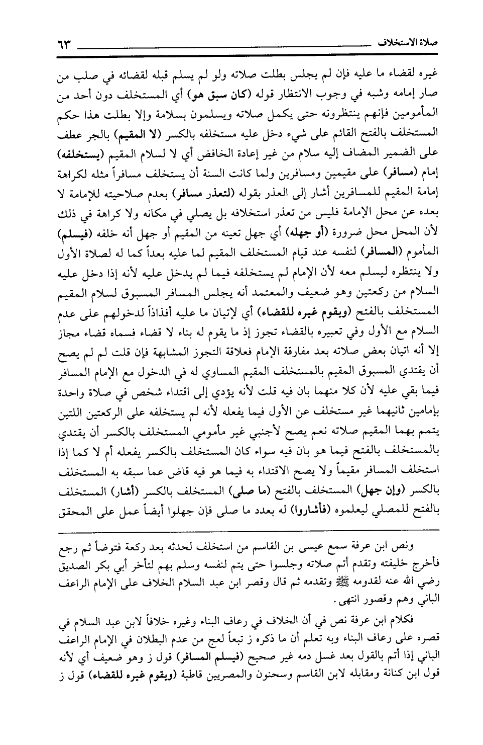 ونص ابن عرفة سمع عيسى بن القاسم من استخلف لحدثه بعد ركعة فتوضأ ثم رجع فأخرج خليفته وتقدم أتم صلاته وجلسوا حتى يتم لنفسه وسلم بهم لتأخر أبي بكر الصديق رضي الله عنه لقدومه - صلى الله عليه وسلم - وتقدمه ثم قال وقصر ابن عبد السلام الخلاف على الإمام الراعف الباني وهم وقصور انتهى.