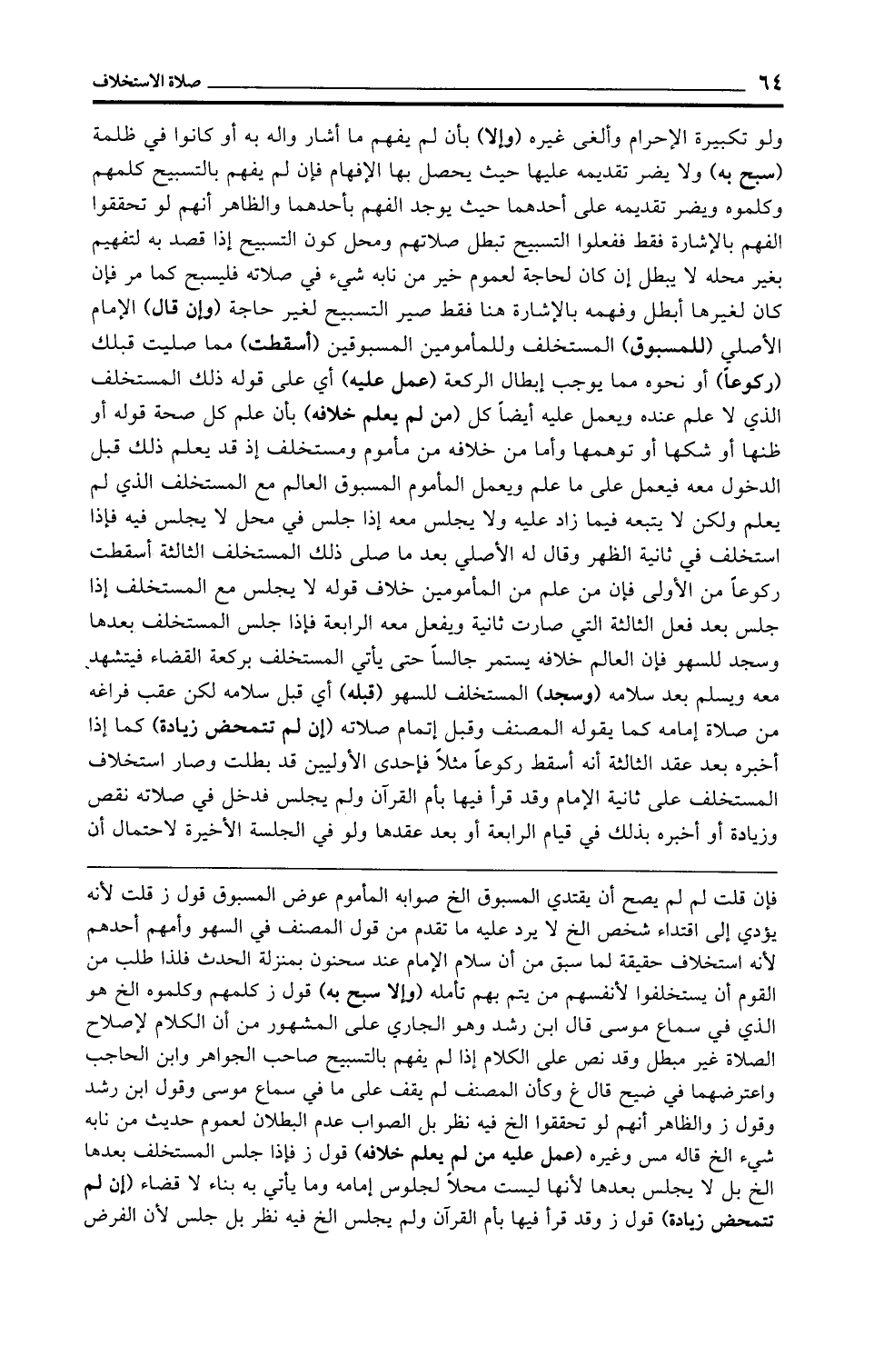 فإن قلت لم لم يصح أن يقتدي المسبوق الخ صوابه المأموم عوض المسبوق قول ز قلت لأنه يؤدي إلى اقتداء شخص الخ لا يرد عليه ما تقدم من قول المصنف في السهو وأمهم أحدهم لأنه استخلاف حقيقة لما سبق من أن سلام الإمام عند سحنون بمنزلة الحدث فلذا طلب من القوم أن يستخلفوا لأنفسهم من يتم بهم تأمله (وإلا سبح به) قول ز كلمهم وكلموه الخ هو الذي في سماع موسى قال ابن رشد وهو الجاري على المشهور من أن الكلام لإصلاح الصلاة غير مبطل وقد نص على الكلام إذا لم يفهم بالتسبيح صاحب الجواهر وابن الحاجب واعترضهما في ضيح قال غ وكأن المصنف لم يقف على ما في سماع موسى وقول ابن رشد وقول ز والظاهر أنهم لو تحققوا الخ فيه نظر بل الصواب عدم البطلان لعموم حديث من نابه شيء الخ قاله مس وغيره (عمل عليه من لم يعلم خلافه) قول ز فإذا جلس المستخلف بعدها الخ بل لا يجلس بعدها لأنها ليست محلًا لجلوس إمامه وما يأتي به بناء لا قضاء (إن لم تتمحض زيادة) قول ز وقد قرأ فيها بأم القرآن ولم يجلس الخ فيه نظر بل جلس لأن الفرض