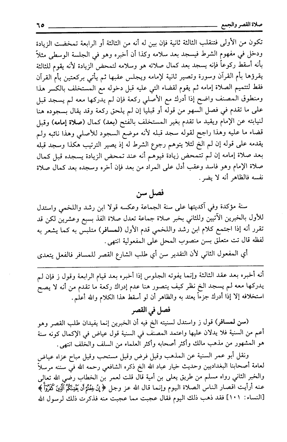 ونقل أبو عمر السنية عن المذهب وقيل فرض وقيل مستحب وقيل مباح عزاه عياض لعامة أصحابنا البغداديين وحديث خيار عباد الله الخ ذكره الشافعي رحمه الله في سننه مرسلًا والخبر الثاني رواه مسلم من طريق يعلى بن أمية قال قلت لعمر بن الخطاب رضي الله تعالى عنه أرأيت إقصار الناس الصلاة اليوم وإنما قال الله عَزَّ وَجَلَّ {إِنْ خِفْتُمْ أَنْ يَفْتِنَكُمُ الَّذِينَ كَفَرُوا} [النساء: 101] فقد ذهب ذلك اليوم فقال عجبت مما عجبت منه فذكرت ذلك لرسول الله