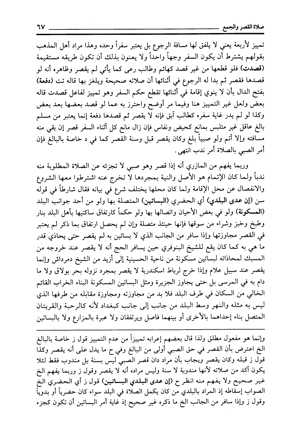 وإنما هو مفعول مطلق ولذا قال بعضهم إعرابه تمييزًا من عدم التمييز قول ز خاصة بالبالغ الخ اعترض بأن القصر في حق الصبي أولى من البالغ وفي ح ما يدل على أنه يقصر وكذا قول ز قبله وكان يقصر ويجاب بأن مراد دان قصر الصبي ليس بسنة بل مندوب فقط لئلا يكون آكد من صلاته لأنها مندوبة لا سنة وليس مراده أنه لا يقصر وقول ز وربما يفهم الخ غير صحيح ولا يفهم منه انظر ح (إن عدى البلدي البساتين) قول ز أي الحضري الخ الصواب إسقاطه إذ المراد بالبلدي من كان يكمل الصلاة في البلاد سواء كان حضريًّا أو بدويًّا وقول ز وإذا سافر من الجانب الخ ما ذكره غير صحيح إذ غاية أمر البساتين أن تكون كجزء