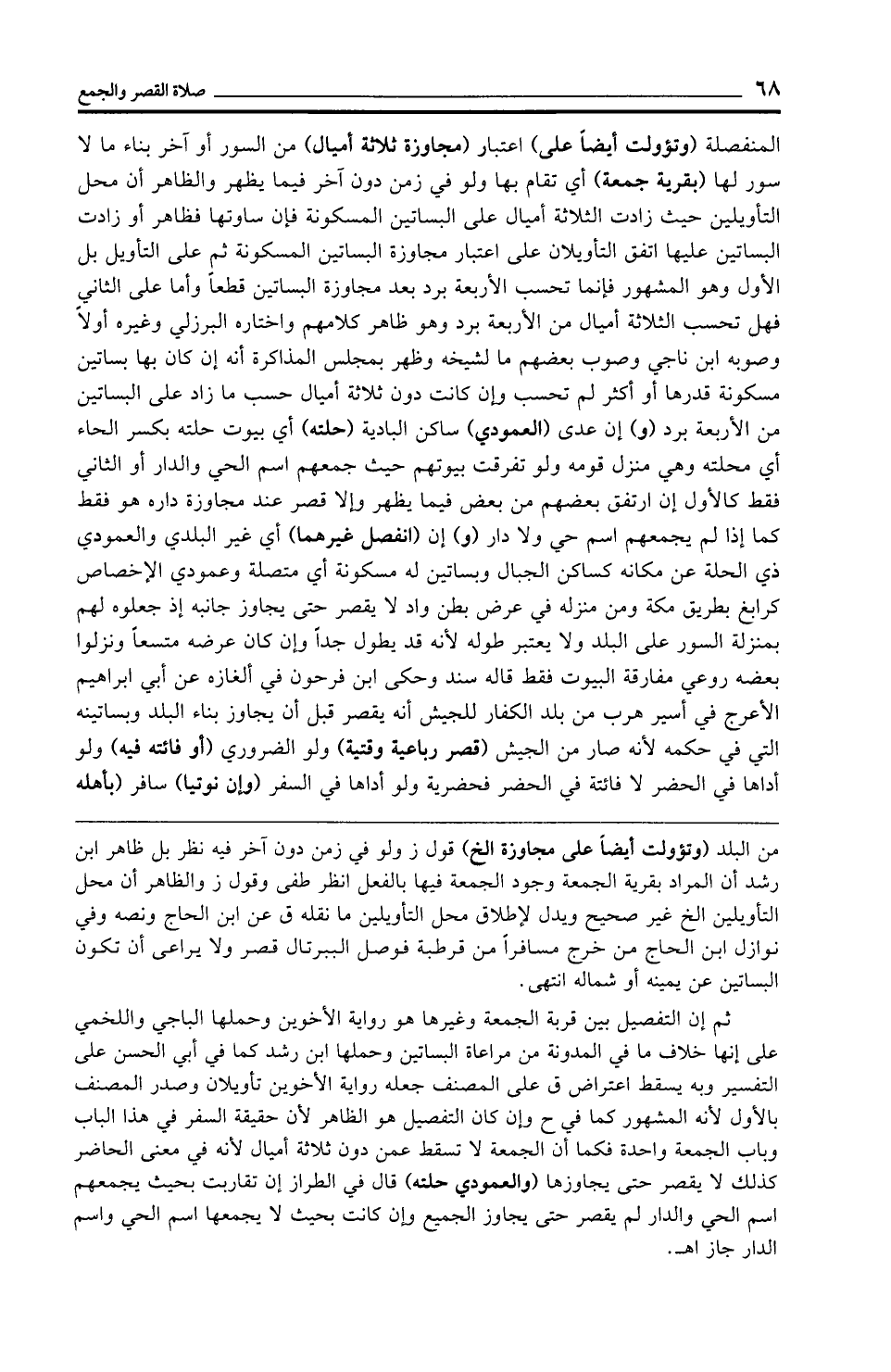 المنفصلة (وتؤولت أيضًا على) اعتبار (مجاوزة ثلاثة أميال) من السور أو آخر بناء ما لا سور لها (بقرية جمعة) أي تقام بها ولو في زمن دون آخر فيما يظهر والظاهر أن محل التأويلين حيث زادت الثلاثة أميال على البساتين المسكونة فإن ساوتها فظاهر أو زادت البساتين عليها اتفق التأويلان على اعتبار مجاوزة البساتين المسكونة ثم على التأويل بل الأول وهو المشهور فإنما تحسب الأربعة برد بعد مجاوزة البساتين قطعًا وأما على الثاني فهل تحسب الثلاثة أميال من الأربعة برد وهو ظاهر كلامهم واختاره البرزلي وغيره أولًا وصوبه ابن ناجي وصوب بعضهم ما لشيخه وظهر بمجلس المذاكرة أنه إن كان بها بساتين مسكونة قدرها أو أكثر لم تحسب وإن كانت دون ثلاثة أميال حسب ما زاد على البساتين من الأربعة برد (و) إن عدى (العمودي) ساكن البادية (حلته) أي بيوت حلته بكسر الحاء أي محلته وهي منزل قومه ولو تفرقت بيوتهم حيث جمعهم اسم الحي والدار أو الثاني فقط كالأول إن ارتفق بعضهم من بعض فيما يظهر وإلا قصر عند مجاوزة داره هو فقط كما إذا لم يجمعهم اسم حي ولا دار (و) إن (انفصل غيرهما) أي غير البلدي والعمودي ذي الحلة عن مكانه كساكن الجبال وبساتين له مسكونة أي متصلة وعمودي الإخصاص كرابغ بطريق مكة ومن منزله في عرض بطن واد لا يقصر حتى يجاوز جانبه إذ جعلوه لهم بمنزلة السور على البلد ولا يعتبر طوله لأنه قد يطول جدًّا وإن كان عرضه متسعًا ونزلوا بعضه روعي مفارقة البيوت فقط قاله سند وحكى ابن فرحون في ألغازه عن أبي إبراهيم الأعرج في أسير هرب من بلد الكفار للجيش أنه يقصر قبل أن يجاوز بناء البلد وبساتينه التي في حكمه لأنه صار من الجيش (قصر رباعية وقتية) ولو الضروري (أو فائته فيه) ولو أداها في الحضر لا فائتة في الحضر فحضرية ولو أداها في السفر (وإن نوتيا) سافر (بأهله