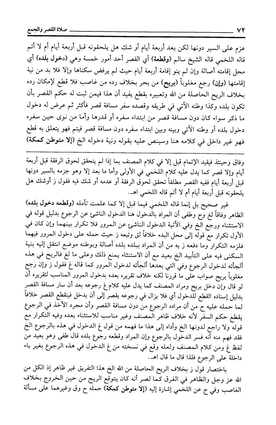 عزم على السير دونها لكن بعد أربعة أيام أو شك هل يلحقونه قبل أربعة أيام أم لا أتم قاله اللخمي قاله الشيخ سالم (وقطعة) أي القصر أحد أمور خمسة وهي (دخول بلده) أي محل إقامته أصالة وإن لم ينو إقامة أربعة أيام حيث لم يرفض سكناها وإلا فلا بد من نية إقامتها (وإن) رجع مغلوبًا (بريح) من بحر بخلاف رده من غاصب فلا قطع لإمكان رده بخلاف الريح الحاصلة من الله وتعبيره بقطع يفيد أن هذا فيمن ثبت له حكم القصر بأن تكون بلده وكذا وطنه الآتي في طريقه وقصده سفر مسافة قصر فأكثر ثم عرض له دخول ما ذكر سواء كان دون مسافة قصر من ابتداء سفره أو قدرها وأما من نوى حين سفره دخول بلده أو وطنه الآتي وبينه وبين ابتداء سفره دون مسافة قصر فيتم فهو يتعلق به قطع فهو غير داخل في كلامه هنا وسينص عليه بقوله ونية دخوله الخ (إلا متوطن كمكة)