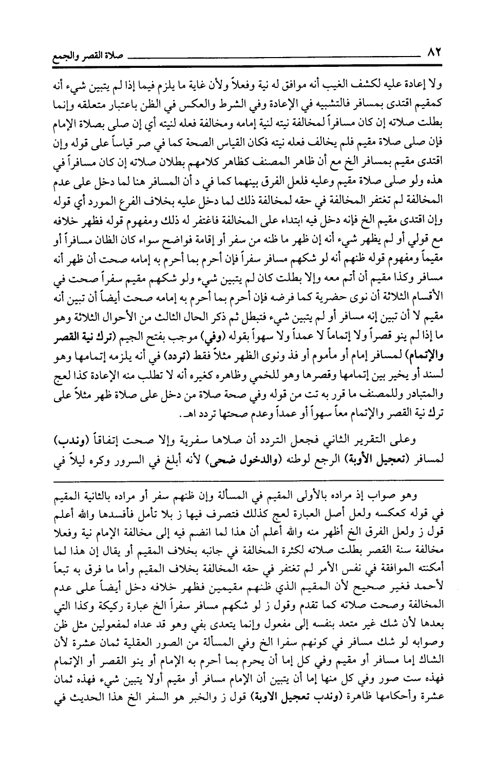 وعلى التقرير الثاني فجعل التردد أن صلاها سفرية وإلا صحت اتفاقًا (وندب) لمسافر (تعجيل الأوبة) المرجع لوطنه (والدخول ضحى) لأنه أبلغ في السرور وكره ليلًا في
