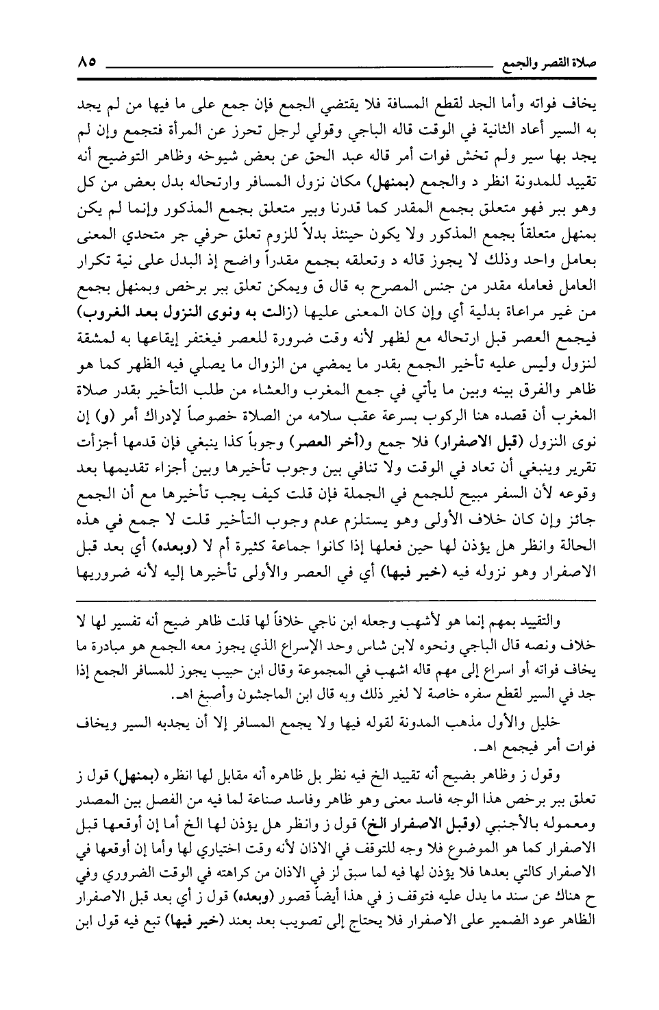 خليل والأول مذهب المدونة لقوله فيها ولا يجمع المسافر إلا أن يجدبه السير ويخاف فوات أمر فيجمع اهـ.