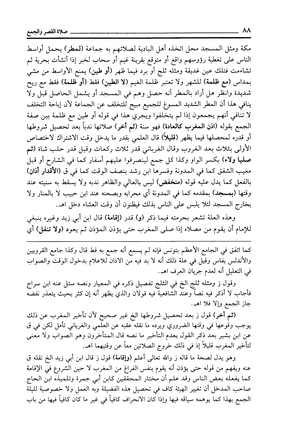 مكة ومثل المسجد محل اتخذه أهل البادية لصلاتهم به جماعة (لمطر) يحمل أواسط الناس على تغطية رؤوسهم واقع أو متوقع بقرينة غير أو سحاب لخبر إذا أنشأت بحرية ثم تشاءمت فتلك عين غديقة ومثله ثلج أو برد فيما ظهر (أو طين) يمنع الأواسط من مشي بمداس (مع ظلمة) للشهر ولا تعتبر ظلمة الغيم (لا الطين) فقط (أو ظلمة) فقط مع ريح شديدة وانظر هل أراد بالمطر أنه حصل وهم في المسجد أو يشمل الحاصل قبل ولا ينافي هذا أن المطر الشديد المسوغ للجميع مبيح للتخلف عن الجماعة لأن إباحة التخلف لا تنافي أنهم يجمعون إذا لم يتخلفوا ويجري هذا في قوله أو طين مع ظلمة بين صفة الجمع بقوله (أذن المغرب كالعادة) فهو سنة (ثم أخر) صلاتها ندبًا بعد تحصيل شروطها أو قدره لمحصلها فيما يظهر (قليلًا) قال العلمي بقدر ما يدخل وقت الاشتراك لاختصاص الأولى بثلاث بعد الغروب وقال الغرباني قدر ثلاث ركعات وقيل قدر حلب شاة (ثم صليا ولاء) بكسر الواو وكذا كل جمع لينصرفوا عليهم أسفار كما في الشارح أو قبل مغيب الشفق كما في المدونة وفسرها ابن رشد بنصف الوقت كما في ق (الأقدار أذان) بالفعل كما يدل عليه قوله (منخفض) ليس بالعالي والظاهر ندبه ولا يسقط به سنيته عند وقتها (بمسجد) بمقدمه كما في المدونة أي محرابه وبصحنه عند ابن حبيب لا بالمنار ولا بخارج المسجد لئلا يلبس على الناس بذلك فيظنون أن وقت العشاء دخل اهـ.