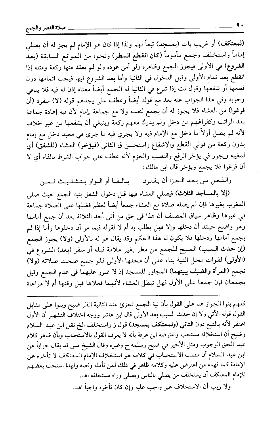 كلهم بنوا الجواز هنا على القول بأن نية الجمع تجزئ عند الثانية انظر ضيح وبنوا على مقابل القول قوله الآتي ولا إن حدث السبب بعد الأولى قال ابن عاشر ووجه اختلاف التشهير أن الأول اغتفر لأنه بالتبع دون الثاني (ولمعتكف بمسجد) قول ز واستخلف الخ نقل ابن عبد السلام وضيح أن استخلافه مستحب واعترضه ابن عرفة بأنه لا يعرف القول بالاستحباب وبأن ظاهر كلام عبد الحق الوجوب ومثل الأخير في ضيح وسلمه ح وغيره وقال الشيخ مس قد يقال جوابًا عن ابن عبد السلام أن مصب الاستحباب في كلامه هو استخلاف الإمام المعتكف لا تأخره عن الإمامة كما فهمه من اعترض عليه وكلامه ظاهر في ذلك لمن تأمله ونصه ولهذا استحب بعضهم للإمام المعتكف أن يستخلف من يصلي بالناس ويصلي وراء مستخلفه اهـ.