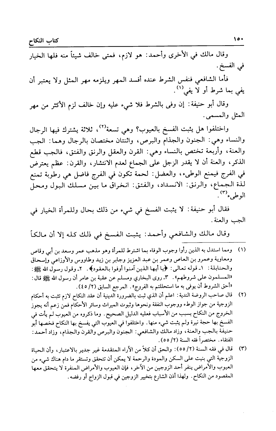 وَاخْتلفُوا هَل يثبت الْفَسْخ بالعيوب؟ وَهِي تِسْعَة، ثَلَاثَة يشْتَرك فِيهَا الرِّجَال وَالنِّسَاء وَهِي: الْجُنُون والجذام والبرص، وَاثْنَانِ مختصان بِالرِّجَالِ وهما: الْجب والعنة، وَأَرْبَعَة تخْتَص بِالنسَاء وَهِي: الْقرن وَالْعقل والرنق والفتق، فالجب قطع الذّكر، والعنة أَن لَا يقدر الرجل على الْجِمَاع لعدم الانتشار، والقرن: عظم يعْتَرض فِي الْفرج فَيمْنَع الوطىء، والعضل: لحْمَة تكون فِي الْفرج فَاضل هِيَ رُطُوبَة تمنع لَذَّة الْجِمَاع، والرنق: الانسداد، والفتق: انخراق مَا بَين مَسْلَك الْبَوْل وَمحل الوطىء.