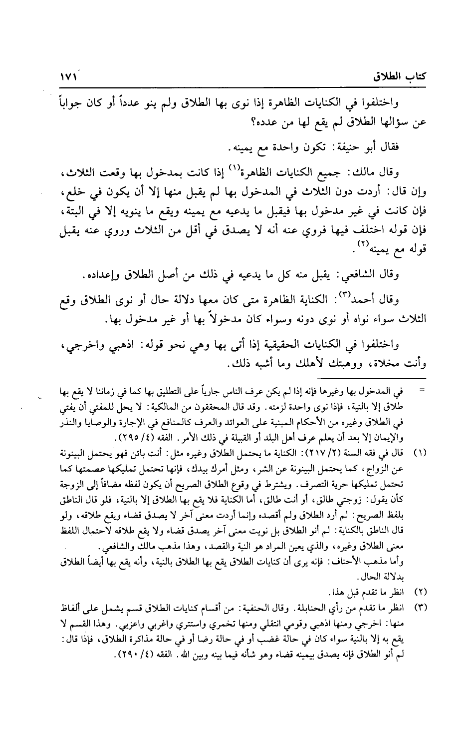 وَاخْتلفُوا فِي الْكِنَايَات الظَّاهِرَة إِذا نوى بهَا الطَّلَاق وَلم ينْو عددا أَو كَانَ جَوَابا عَن سؤالها الطَّلَاق لم يَقع لَهَا من عدده؟
