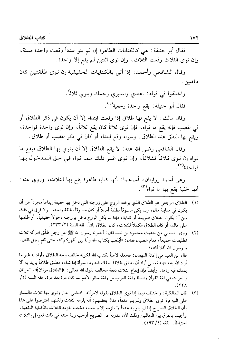 فَقَالَ أَبُو حنيفَة: هِيَ كالكيانات الظَّاهِرَة إِن لم ينْو عددا وَقعت وَاحِدَة مبينَة، وَإِن نوى الثَّلَاث وَقعت الثَّلَاث، وَإِن نوى اثْنَتَيْنِ لم يَقع إِلَّا وَاحِدَة.