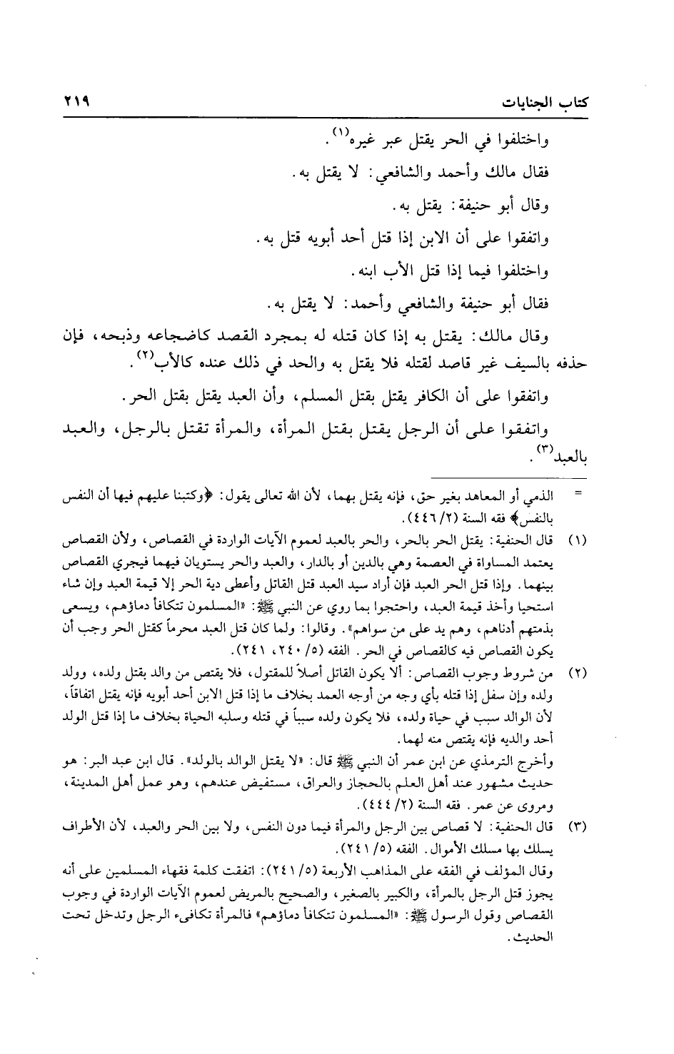 وَاتَّفَقُوا على أَن الْكَافِر يقتل بقتل الْمُسلم، وَأَن العَبْد يقتل بقتل الْحر.
