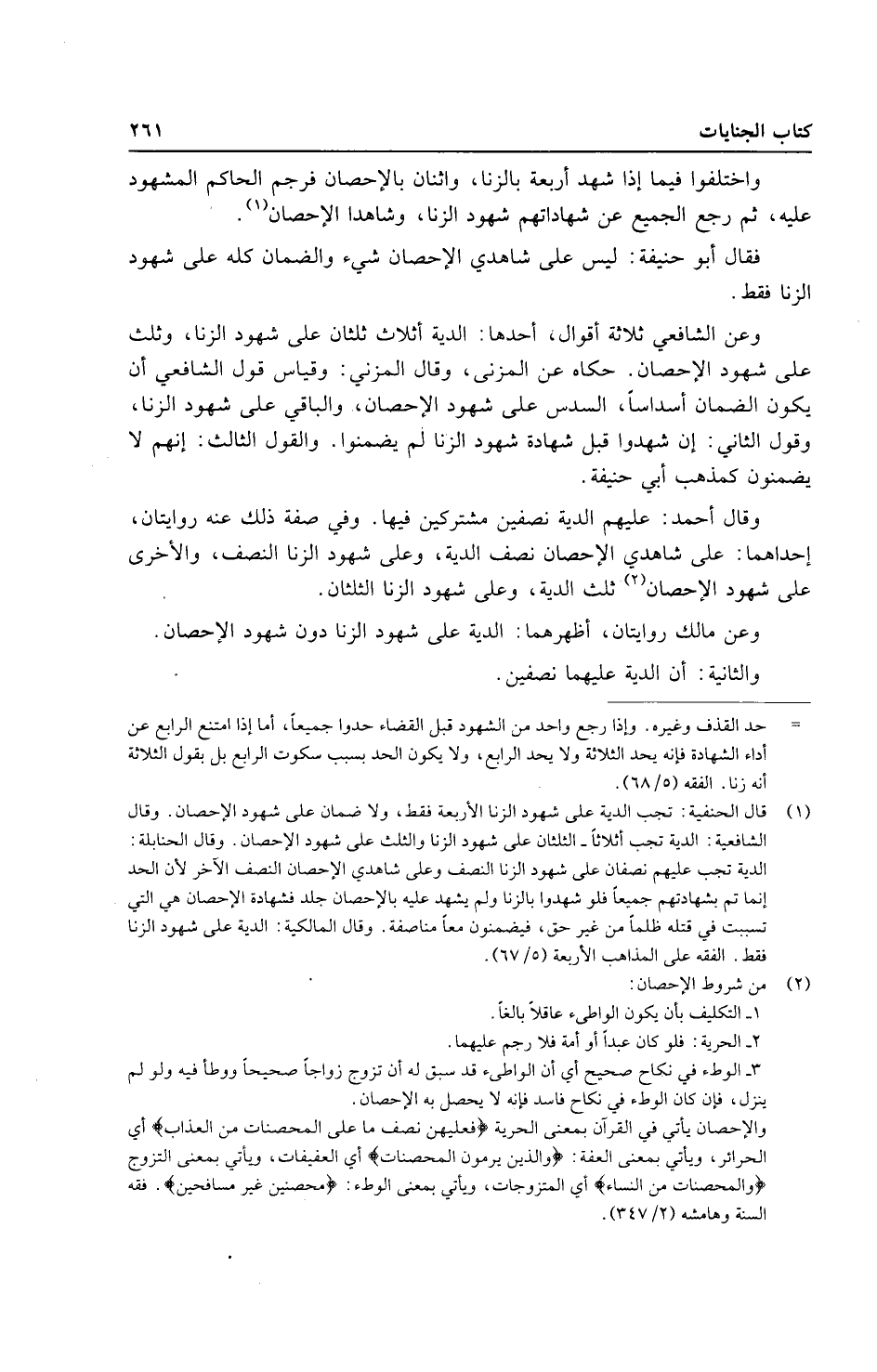 وَعَن الشَّافِعِي ثَلَاثَة أَقْوَال، أَحدهَا: الدِّيَة أَثلَاث ثلثان على شُهُود الزِّنَا، وَثلث على شُهُود الْإِحْصَان. حَكَاهُ عَن الْمُزنِيّ، وَقَالَ الْمُزنِيّ: وَقِيَاس قَول الشَّافِعِي أَن يكون الضَّمَان أسداسا، السُّدس على شُهُود الْإِحْصَان، وَالْبَاقِي على شُهُود الزِّنَا، وَقَول الثَّانِي: إِن شهدُوا قبل شَهَادَة شُهُود الزِّنَا لم يضمنوا. وَالْقَوْل الثَّالِث: إِنَّهُم لَا يضمنُون كمذهب أبي حنيفَة.