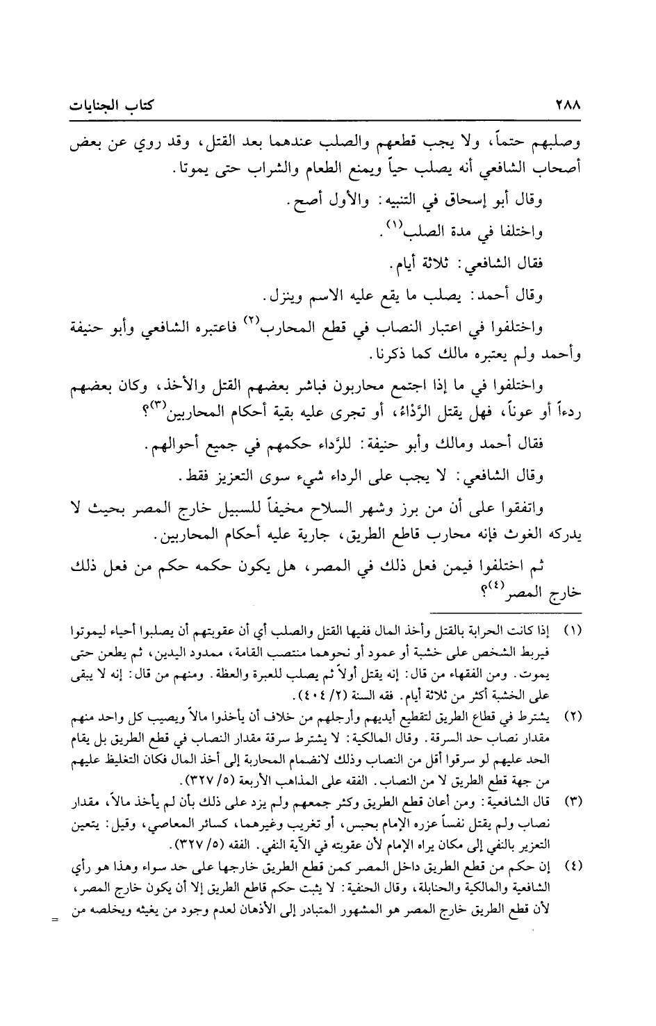 وصلبهم حتما، وَلَا يجب قطعهم والصلب عِنْدهمَا بعد الْقَتْل، وَقد رُوِيَ عَن بعض أَصْحَاب الشَّافِعِي أَنه يصلب حَيا وَيمْنَع الطَّعَام وَالشرَاب حَتَّى يموتا.