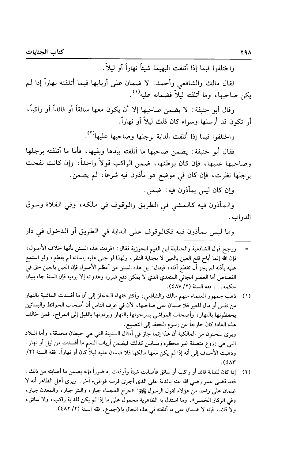 فَقَالَ مَالك وَالشَّافِعِيّ وَأحمد: لَا ضَمَان على أَرْبَابهَا فِيمَا أتلفته نَهَارا إِذا لم يكن صَاحبهَا، وَمَا أتلفته لَيْلًا فضمانه عَلَيْهِ.