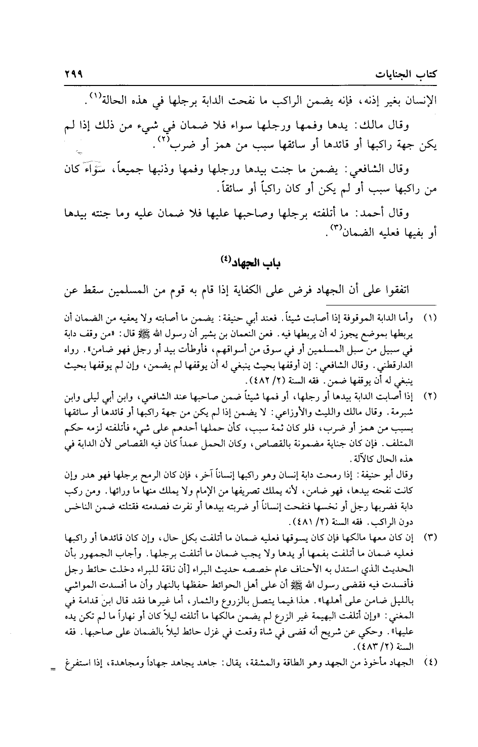 وَقَالَ أَحْمد: مَا أتلفته برجلها وصاحبها عَلَيْهَا فَلَا ضَمَان عَلَيْهِ وَمَا جنته بِيَدِهَا أَو بفيها فَعَلَيهِ الضَّمَان.