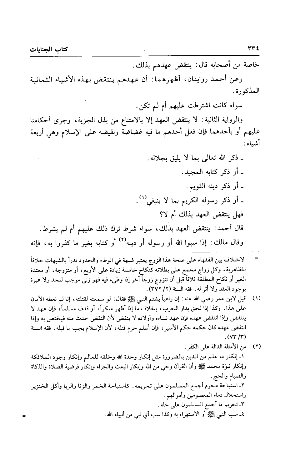 وَالرِّوَايَة الثَّانِيَة: لَا ينْتَقض الْعَهْد إِلَّا بالامتناع من بذل الْجِزْيَة، وَجرى أحكامنا عَلَيْهِم أَو بِأَحَدِهِمَا فَإِن فعل أحدهم مَا فِيهِ غَضَاضَة ونقيضه على الْإِسْلَام وَهِي أَرْبَعَة أَشْيَاء. - ذكر الله تَعَالَى بِمَا لَا يَلِيق بجلاله. - أَو ذكر كِتَابه الْمجِيد. - أَو ذكر دينه القويم. - أَو ذكر رَسُوله الْكَرِيم بِمَا لَا يَنْبَغِي.