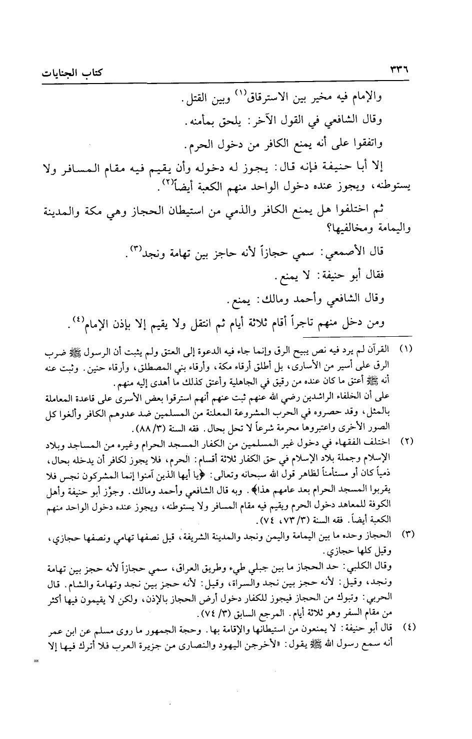 ثمَّ اخْتلفُوا هَل يمْنَع الْكَافِر وَالذِّمِّيّ من استيطان الْحجاز وَهِي مَكَّة وَالْمَدينَة واليمامة ومخالفيها؟