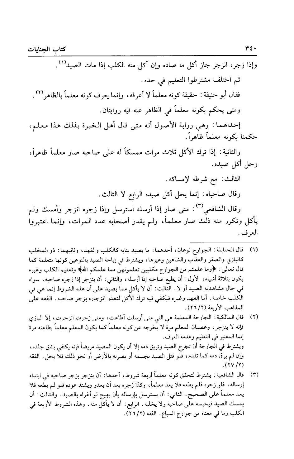 وَقَالَ الشَّافِعِي: مَتى صَار إِذا أرْسلهُ استرسل وَإِذا زَجره انزجر وَأمْسك وَلم يَأْكُل وتكرر مِنْهُ ذَلِك صَار معلما، وَلم يقدر أَصْحَابه عدد المرات وَإِنَّمَا اعتبروا الْعرف.