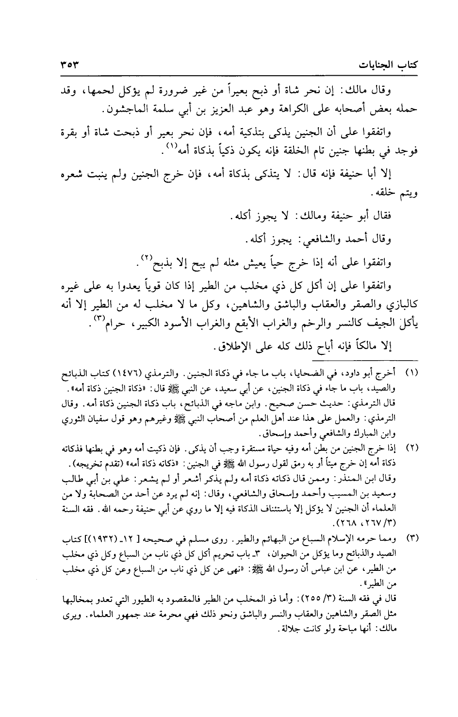 وَاتَّفَقُوا على أَن الْجَنِين يذكى بتذكية أمه، فَإِن نحر بعير أَو ذبحت شَاة أَو بقرة فَوجدَ فِي بَطنهَا جَنِين تَامّ الْخلقَة فَإِنَّهُ يكون ذكيا بِذَكَاة أمه.