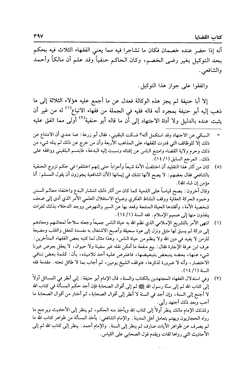 إِلَّا أَبَا حنيفَة لم يجز هَذِه الْوكَالَة فَعدل عَن مَا أجمع عَلَيْهِ هَؤُلَاءِ الثَّلَاثَة إِلَى مَا ذهب إِلَيْهِ أَبُو حنيفَة بِمُجَرَّد أَنه قَالَ فَقِيه فِي الْجُمْلَة من فُقَهَاء الِاتِّبَاع لَهُ من غير أَن يثبت عِنْده بِالدَّلِيلِ وَلَا أَدَاة الِاجْتِهَاد إِلَّا أَن مَا قَالَه أَبُو حنيفَة أولى مِمَّا اتّفق عَلَيْهِ