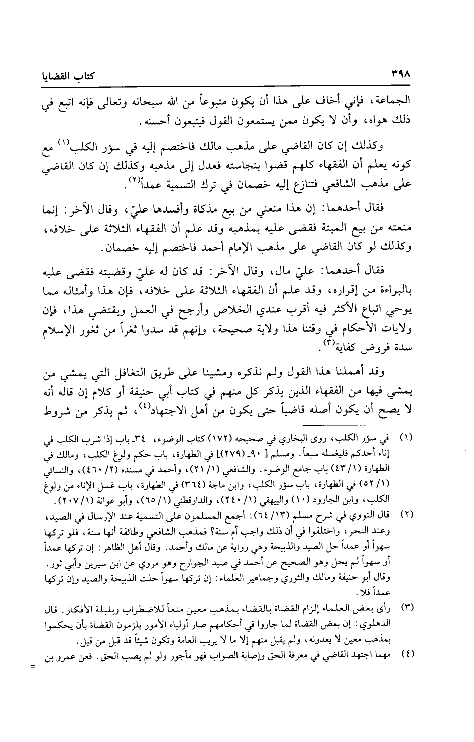 وَكَذَلِكَ إِن كَانَ القَاضِي على مَذْهَب مَالك فاختصم إِلَيْهِ فِي سُؤْر الْكَلْب مَعَ كَونه يعلم أَن الْفُقَهَاء كلهم قضوا بِنَجَاسَتِهِ فَعدل إِلَى مذْهبه وَكَذَلِكَ إِن كَانَ القَاضِي على مَذْهَب الشَّافِعِي فَتَنَازَعَ إِلَيْهِ خصمان فِي ترك التَّسْمِيَة عمدا.