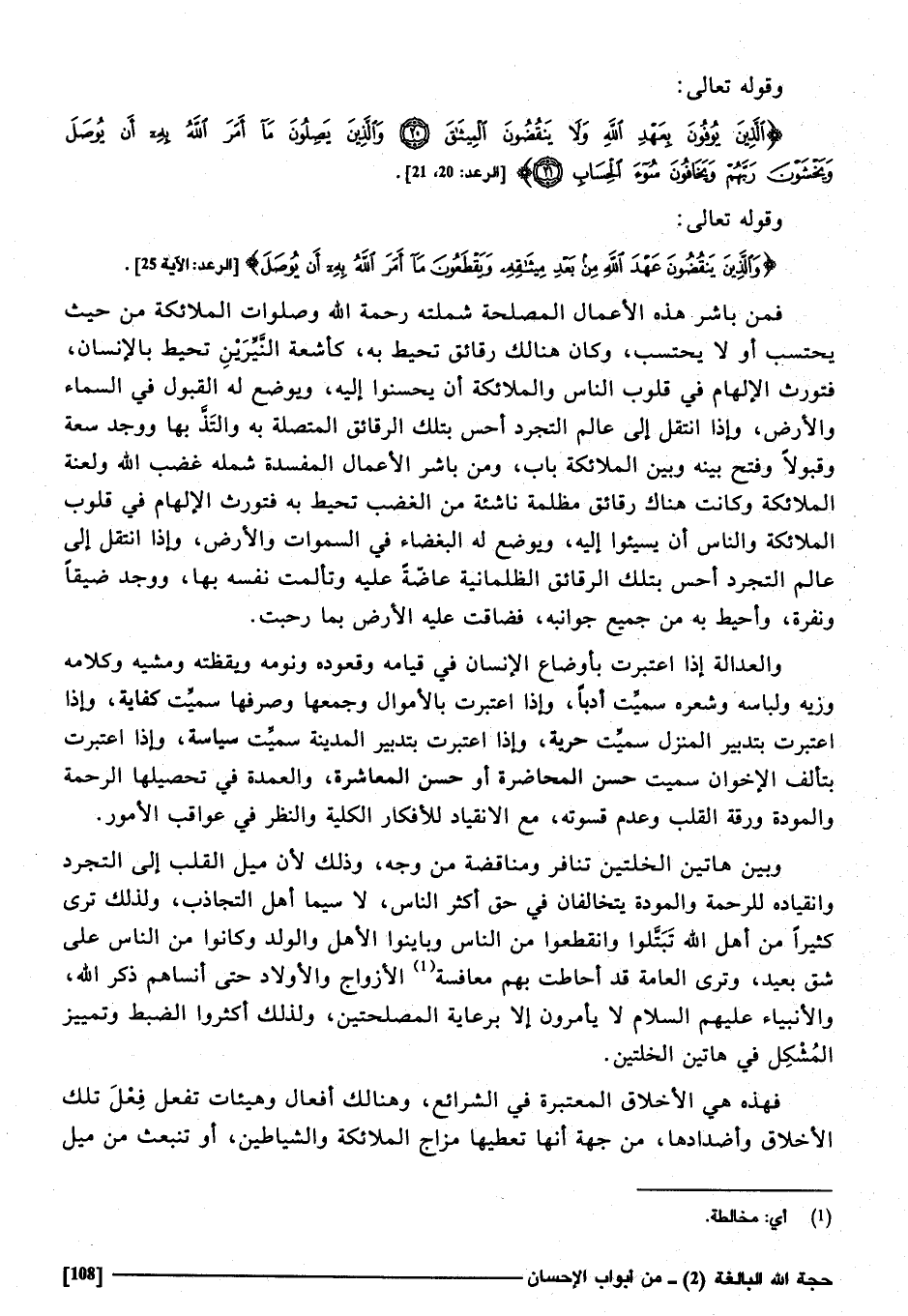 عَلَيْهِم السَّلَام لَا يأمرون إِلَّا برعاية المصلحتين، وَلذَلِك أَكْثرُوا الضَّبْط وتمييز الْمُشكل فِي هَاتين الخلتين، فَهَذِهِ هِيَ الْأَخْلَاق الْمُعْتَبرَة فِي الشَّرَائِع، وهنالك أَفعَال وهيآت تفعل فعل تِلْكَ الْأَخْلَاق وأضدادها من جِهَة أَنَّهَا تعطيها مزاج الْمَلَائِكَة وَالشَّيَاطِين، أَو تنبعث من ميل