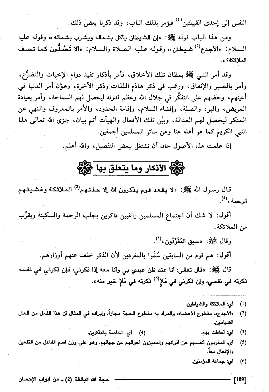 وَقَوله عَلَيْهِ السَّلَام: " الاجدع شَيْطَان " وَقَوله عَلَيْهِ الصَّلَاة وَالسَّلَام: " أَلا تصفون كَمَا تصف الْمَلَائِكَة، وَقد أَمر النَّبِي صَلَّى اللهُ عَلَيْهِ وَسَلَّمَ بمظان تِلْكَ الْأَخْلَاق، فَأمر بأذكار تفِيد دوَام الإخبات والتضرع، وَأمر بِالصبرِ والانفاق، وَرغب فِي ذكر هاذم اللَّذَّات وَذكر الْآخِرَة، وهون أَمر الدُّنْيَا فِي أَعينهم، وحضهم على التفكر فِي جلال الله وَعظم قدرته، ليحصل لَهُم السماحة، وَأمر بعيادة الْمَرِيض وَالْبر والصلة وإفشاء السَّلَام وَإِقَامَة الْحُدُود وَالْأَمر بِالْمَعْرُوفِ وَالنَّهْي عَن الْمُنكر، ليحصل لَهُم الْعَدَالَة، وَبَين تِلْكَ الْأَفْعَال والهيآت أتم بَيَان، جزى الله تَعَالَى هَذَا النَّبِي الْكَرِيم كَمَا هُوَ أَهله عَنَّا وَعَن سَائِر الْمُسلمين أَجْمَعِينَ.