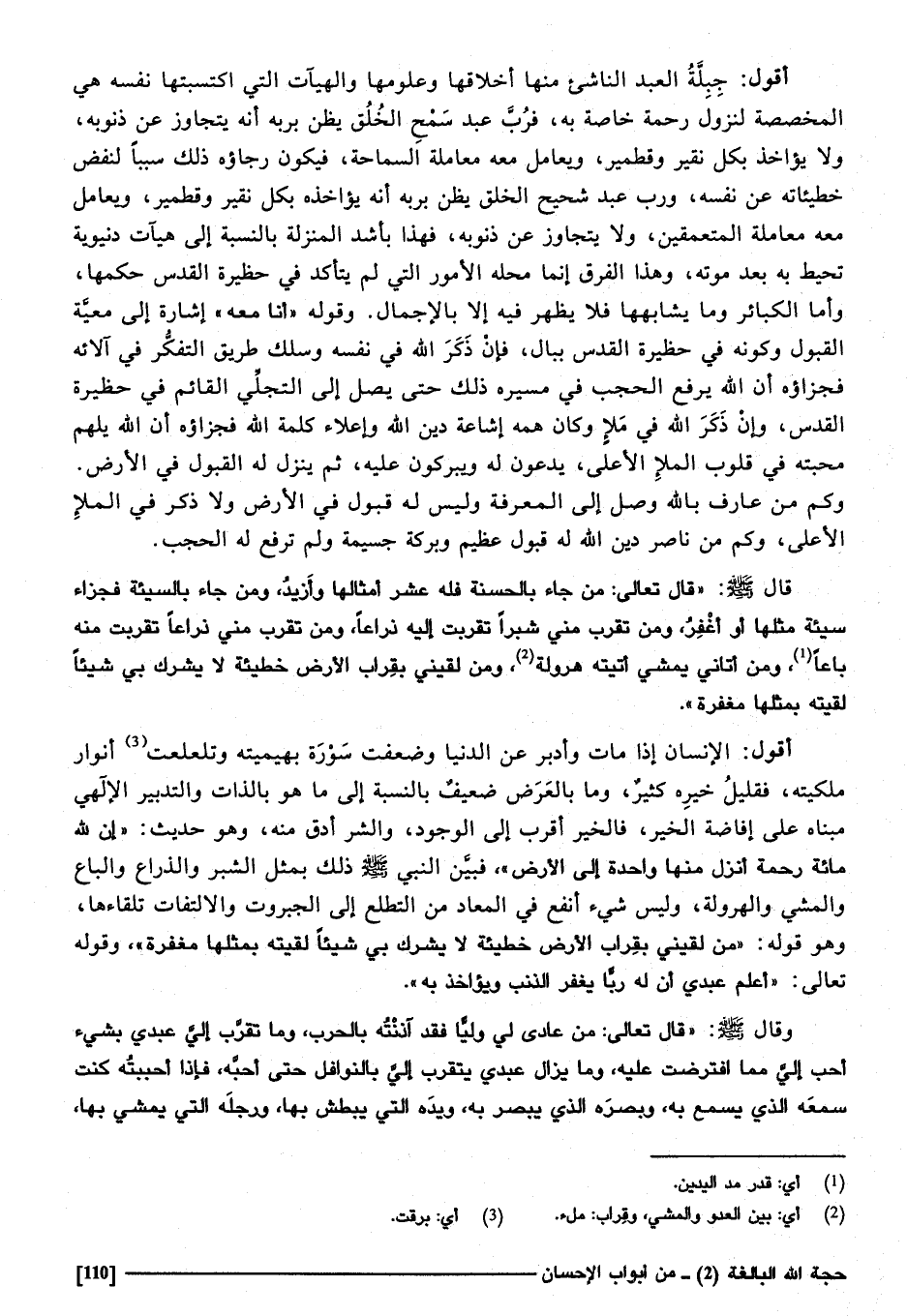 قَالَ صَلَّى اللهُ عَلَيْهِ وَسَلَّمَ: " قَالَ تَعَالَى: من جَاءَ بِالْحَسَنَة فَلهُ عشر أَمْثَالهَا وأزيد، وَمن جَاءَ بِالسَّيِّئَةِ فجزاء سَيِّئَة مثلهَا، أَو أَغفر، وَمن تقرب مني شبْرًا تقربت إِلَيْهِ ذِرَاعا، وَمن تقرب مني ذِرَاعا تقربت مِنْهُ باعا وَمن أَتَانِي يمشي أَتَيْته هرولة وَمن لَقِيَنِي بقراب الأَرْض خطيئه لَا يُشْرك بِي شَيْئا لَقيته بِمِثْلِهَا مغْفرَة " أَقُول: الْإِنْسَان إِذا مَاتَ، وَأدبر عَن الدُّنْيَا، وضعفت سُورَة بهيميته، وتلعلعت أنوار ملكيته، فقليل خَيره كثير، وَمَا بِالْعرضِ ضَعِيف بِالنِّسْبَةِ إِلَى مَا هُوَ بِذَات وَالتَّدْبِير الإلهي مبناه على إفَاضَة الْخَيْر، فالخير أقرب إِلَى الْوُجُود وَالشَّر أدق مِنْهُ، وَهُوَ حَدِيث " إِن لله مائَة رَحْمَة أنزل مِنْهَا وَاحِدَة إِلَى الأَرْض " فَبين النَّبِي صَلَّى اللهُ عَلَيْهِ وَسَلَّمَ ذَلِك بِمثل الشبر. والذراع. والباع وَالْمَشْي. والهرولة، وَلَيْسَ شَيْء أَنْفَع فِي الْمعَاد من التطلع إِلَى الجبروت والالتفات تلقاءها، وَهُوَ قَوْله " من لَقِيَنِي بقراب الأَرْض خَطِيئَة لَا يُشْرك بِي شَيْئا لَقيته بِمِثْلِهَا مغْفرَة "، وَقَوله تَعَالَى: " أعلم عَبدِي أَن لَهُ رَبًّا يغْفر الذَّنب ويؤاخذ بِهِ ".