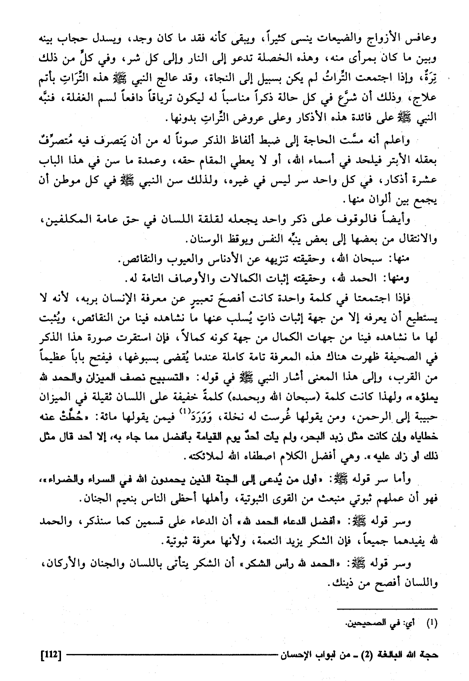 وَمِنْهَا الْحَمد لله، وَحَقِيقَته إِثْبَات الكمالات والأوصاف التَّامَّة لَهُ، فَإِذا اجتمعتا فِي كلمة وَاحِدَة كَانَت أفْصح تَعْبِير عَن معرفَة الْإِنْسَان بربه لِأَنَّهُ لَا يَسْتَطِيع أَن يعرفهُ إِلَّا من جِهَة إِثْبَات ذَات يسلب عَنْهَا مَا نشاهده فِينَا من النقائص، وَيثبت لَهَا مَا نشاهده فِينَا من جِهَات الْكَمَال من جِهَة كَونه كمالا، فَإِذا اسْتَقَرَّتْ صُورَة هَذَا الذّكر فِي الصَّحِيفَة ظَهرت هُنَاكَ هَذِه الْمعرفَة تَامَّة كَامِلَة عِنْدَمَا يقْضى بسبوغها، فَيفتح بَابا عَظِيما من الْقرب، وَإِلَى هَذَا الْمَعْنى أَشَارَ النَّبِي صَلَّى اللهُ عَلَيْهِ وَسَلَّمَ فِي قَوْله: التَّسْبِيح نصف الْمِيزَان وَالْحَمْد الله يملؤه " وَلِهَذَا كَانَت كلمة سُبْحَانَ الله وَبِحَمْدِهِ كلمة خَفِيفَة على اللِّسَان ثَقيلَة فِي الْمِيزَان حَبِيبَة إِلَى الرَّحْمَن، وَمن يَقُولهَا: غرست لَهُ نَخْلَة، وَورد فِيمَن يَقُولهَا مائَة حطت عَنهُ خطاياه وَإِن كَانَت مثل زبد الْبَحْر، وَلم يَأْتِ أحد يَوْم الْقِيَامَة بِأَفْضَل مِمَّا جَاءَ بِهِ إِلَّا أحد قَالَ: مثل ذَلِك أَو وَزَاد عَلَيْهِ، وَهِي أفضل الْكَلَام اصطفاه الله لملائكته.