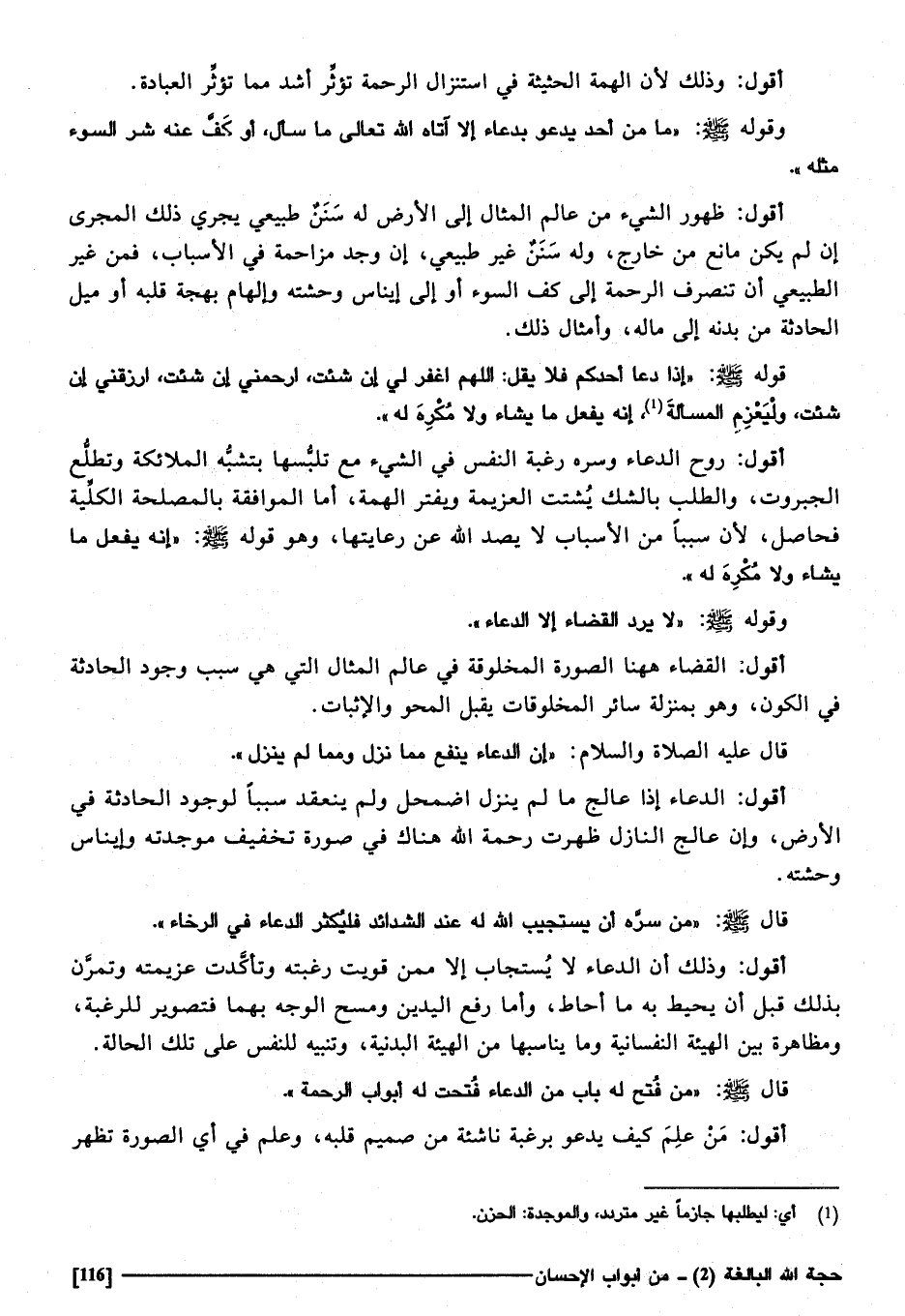 قَالَ عَلَيْهِ الصلاو وَالسَّلَام إِن هما: " أَن الدُّعَاء ينفع بِمَا نزل وَمِمَّا لم ينزل ". أَقُول: الدُّعَاء إِذا عالج مَا لم ينزل اضمحل، وَلم ينْعَقد سَببا لوُجُود الْحَادِثَة فِي الأَرْض، وَإِن عالج النَّازِل ظَهرت رَحْمَة الله هُنَاكَ فِي صُورَة تخفف موجدته وإيناس وحشته.