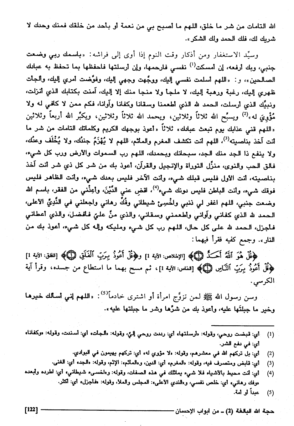 الْكَرِيم وكلماتك التامات من شَرّ مَا أَنْت آخذ بناصيته اللَّهُمَّ أَنْت تكشف المغرم والمأثم، اللَّهُمَّ لَا يهْزم جندك، وَلَا يخلف وَعدك وَلَا ينفع ذَا الْجد مِنْك الْجد سُبْحَانَكَ وَبِحَمْدِك، اللَّهُمَّ رب السَّمَوَات وَالْأَرْض وَرب كل شَيْء فالق الْحبّ والنوى منزل التَّوْرَاة وَالْإِنْجِيل وَالْقُرْآن أعوذ بك من شَرّ كل ذِي شَرّ أَنْت آخذ بناصيته، أَنْت الأول فَلَيْسَ قبلك شَيْء، وَأَنت الآخر فَلَيْسَ بعْدك شَيْء، وَأَنت الظَّاهِر فَلَيْسَ فَوْقك شَيْء، وَأَنت الْبَاطِن فَلَيْسَ دُونك شَيْء اقْضِ عني الدّين، وأعذني من الْفقر، باسم الله وضعت جَنْبي، اللَّهُمَّ اغْفِر لي ذَنبي واخسأ شيطاني وَفك رهاني، واجعلني فِي الندى الْأَعْلَى الْحَمد لله الَّذِي كفاني، وآواني، وأطعمني، وسقاني، وَالَّذِي من على فأفضل، وَالَّذِي أَعْطَانِي فأجزل الْحَمد لله على كل حَال اللَّهُمَّ رب كل شَيْء ومليكه، وإله كل شَيْء أعوذ بك من النَّار - وَجمع كفيه - فَقَرَأَ فيهمَا