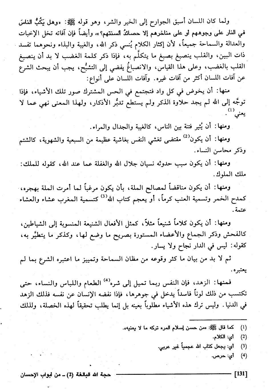 وَلما كَانَ اللِّسَان أسبق الْجَوَارِح إِلَى الْخَيْر وَالشَّر، وَهُوَ قَوْله صَلَّى اللهُ عَلَيْهِ وَسَلَّمَ: " وَهل يكب النَّاس على مناخرهم إِلَّا حصائد ألسنتهم "، وَأَيْضًا فَإِن آفاته تخل الإخبات وَالْعَدَالَة والسماحة جَمِيعًا لِأَن إكثار الْكَلَام ينسي ذكر الله، والغيبة وَالْبذَاء وَنَحْوهمَا تفْسد ذَات الْبَين، وَالْقلب ينصبغ بصبغ مَا يتَكَلَّم بِهِ فَإِذا ذكر كلمة الْغَضَب لَا بُد أَن ينصبغ الْقلب بِالْغَضَبِ وعَلى هَذَا الْقيَاس، والانصباغ يُفْضِي إِلَى التشبح - يجب أَن يبْحَث الشَّرْع عَن آفَات اللِّسَان أَكثر من آفَات غَيره، وآفات اللِّسَان على أَنْوَاع: