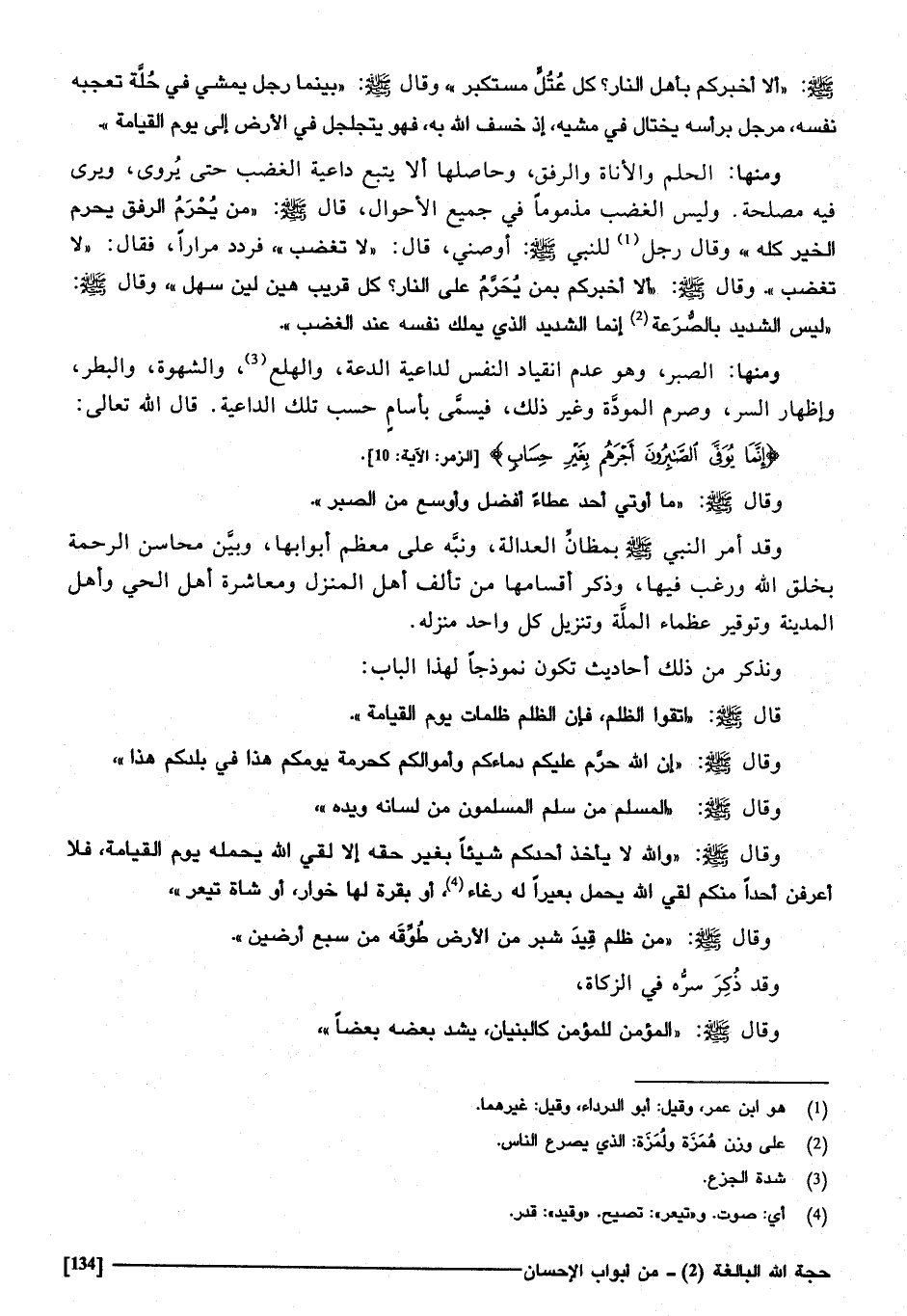 وَمِنْهَا الْحلم والأناة والرفق، وحاصلها أَلا يتبع دَاعِيَة الْغَضَب حَتَّى يرْوى، وَيرى فِي مصلحَة، وَلَيْسَ الْغَضَب مذموما فِي جَمِيع الْأَحْوَال قَالَ صَلَّى اللهُ عَلَيْهِ وَسَلَّمَ: