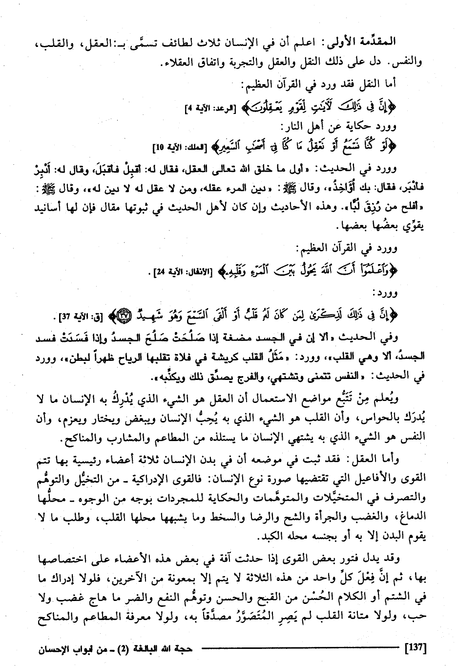 الْمُقدمَة الأولى أعلم أَن فِي الْإِنْسَان ثَلَاث لطائف تسمى بِالْعقلِ، وَالْقلب، وَالنَّفس، دلّ على ذَلِك النَّقْل، وَالْعقل، والتجربة، واتفاق الْعُقَلَاء.